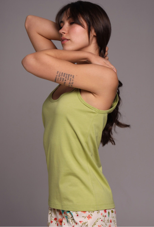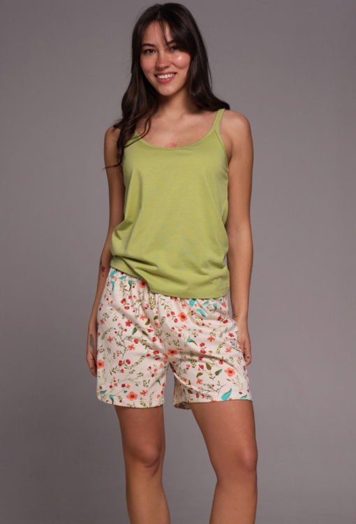 Яскрава жіноча піжама з колекції Прованс від українського бренду German Volf. Піжама виконана з якісної та м'якої бавовни, складається з майки оливкового кольору та кремових шортів з принтом у вигляді польових кольорів оливкового та персикового кольору. Майка вільного силуету на тонких бретелях та з круглим декольте, шорти прямого крою та з м'якою гумкою у поясі. Піжама дуже красива і комфортна, ідеально підходить для сну та домашнього відпочинку, а також стане чудовим подарунком коханій та близькій людині.