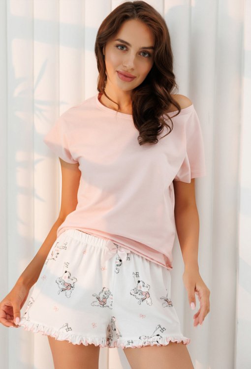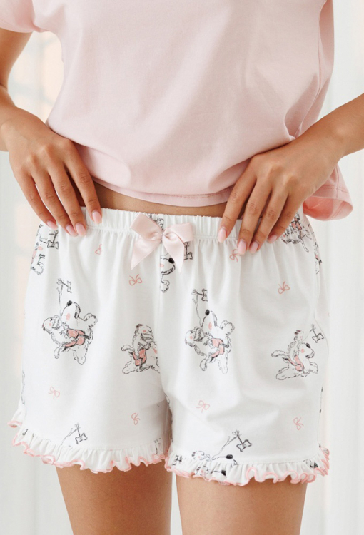 Стильна жіноча піжама з колекції Провокація від українського бренду Roksana. Піжама виконана з м'якої та якісної бавовни, складається з футболки рожевого кольору та білих шортів із кумедним принтом у вигляді котів та собак. Футболка вільного силуету, з короткими рукавами та широким вирізом горла "човник". Шорти також вільного крою, з м'якою гумкою в поясі та чарівними рюшами внизу, прикрашені рожевим бантиком на талії. Піжама дуже красива і приємна до тіла, ідеальна для сну та затишного домашнього відпочинку, а також може бути корисним подарунком коханій та близькій людині.