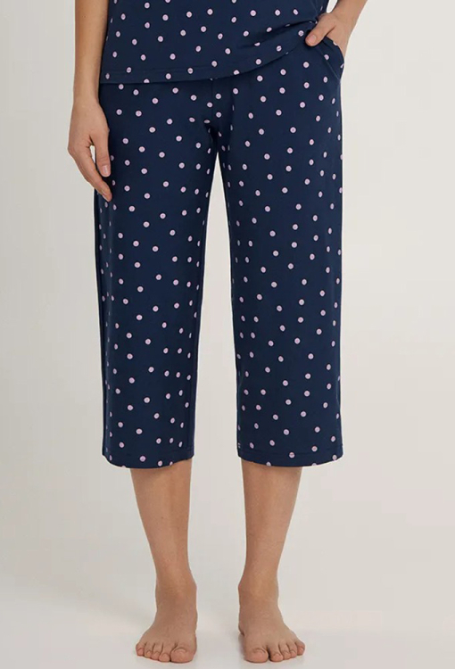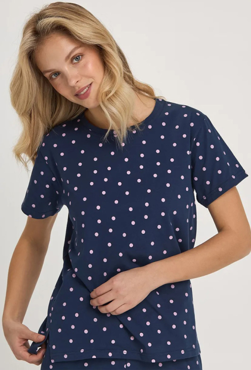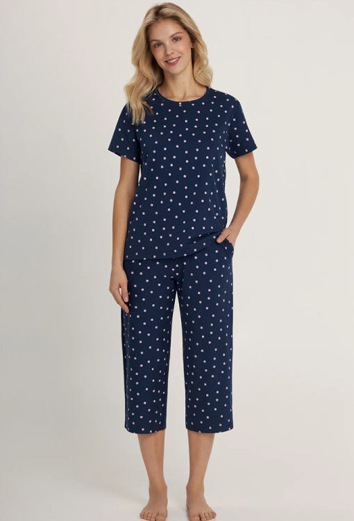 Стильна жіноча піжама з колекції Rosy Raindrops від українського бренду Ellen. Піжама виконана з якісної та м'якої бавовни, синього кольору в рожевий гороховий принт, складається з футболки та капрі. Футболка прямого силуету, з короткими рукавами та круглим вирізом горла, з боків унизу оброблена розрізами. Капрі також прямі, з м'якою гумкою в поясі та зручними бічними кишенями. Піжама дуже красива і комфортна, також може бути чудовим одягом для дому або корисним подарунком коханій та близькій людині.