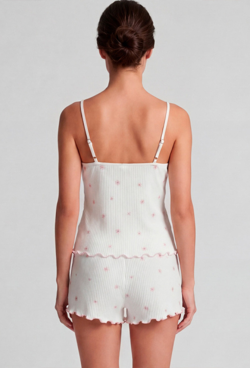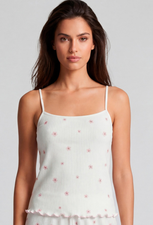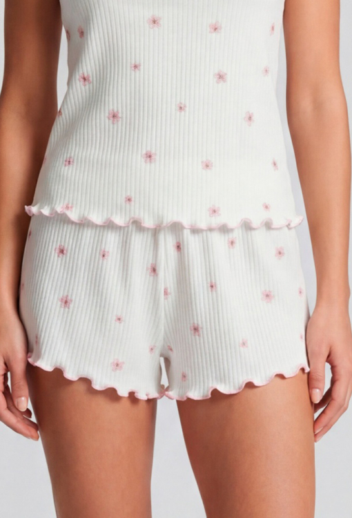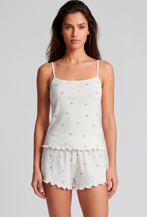 Ніжна жіноча піжама з колекції Kvitto від українського бренду Roksana. Піжама виконана з м'якої та якісної бавовни в рубчик, білого кольору з принтом у вигляді маленьких рожевих квіточок, складається з майки та шортів прямого силуету. Майка на тонких бретелях, що регулюються, і з прямокутним декольте, внизу прикрашена хвилястим швом рожевого кольору. Шорти з м'якою гумкою в поясі та хвилястою обробкою внизу, створюють зручну посадку і не обмежують рухів. Піжама дуже красива і приємна до тіла, ідеальна для сну будь-якої пори року, а також може бути корисним подарунком коханій та близькій людині.