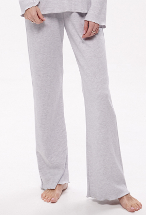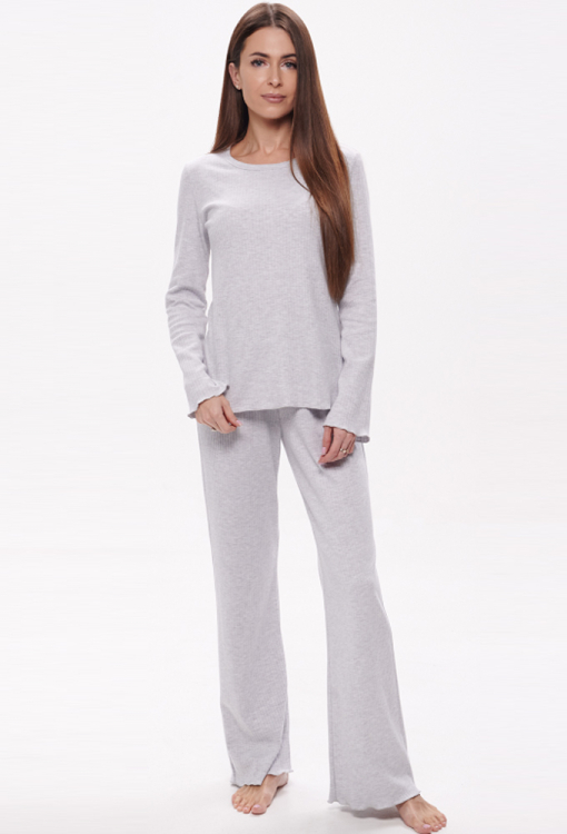 Ніжна та приємна до тіла жіноча піжама від українського бренду Wiktoria. Піжама виконана з якісної та м'якої бавовни в рубчик сірого кольору, складається з кофти та штанів вільного силуету. Кофта з довгими рукавами та круглим вирізом горла, горловина оброблена кантом, рукави та низ прикрашені хвилястим швом. Штани з комфортною посадкою та м'якою гумкою в поясі, внизу також оздоблені декоративним швом. Піжама стильна і дуже зручна, також може бути використана як домашній одяг або подарунок коханій та близькій людині.
