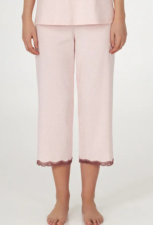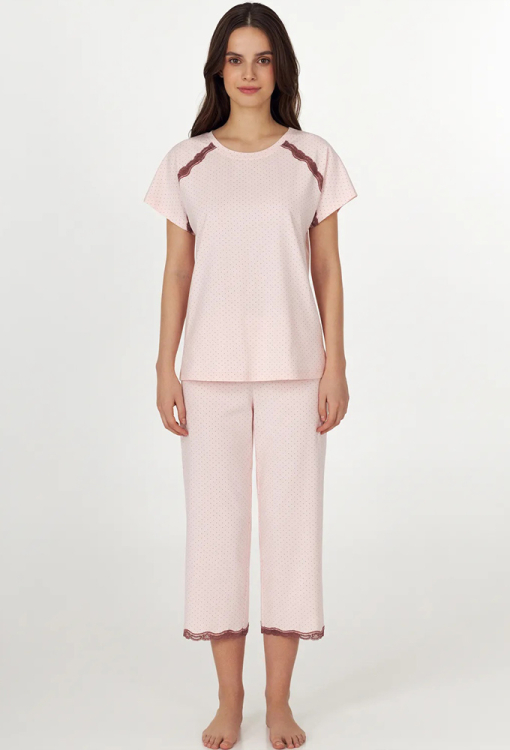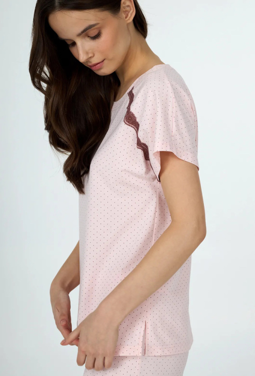Стильна жіноча піжама з колекції Sherry від українського бренду Ellen. Піжама виконана з якісної та м'якої бавовни, рожевого кольору в графітовий точковий принт, складається з футболки та капрі прямого силуету. Футболка з короткими рукавами та круглим вирізом горла, з боків унизу оброблена розрізами, по лінії реглана прикрашена тонким мереживом коричневого кольору. Капрі зі зручною посадкою та м'якою гумкою в поясі, внизу прикрашені вставками з ажурного мережива коричневого кольору. Піжама дуже красива і комфортна, може бути чудовим одягом для дому або корисним подарунком коханій та близькій людині.