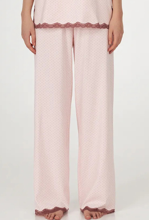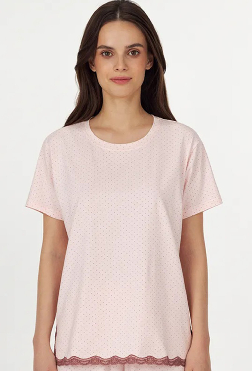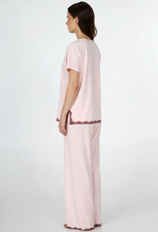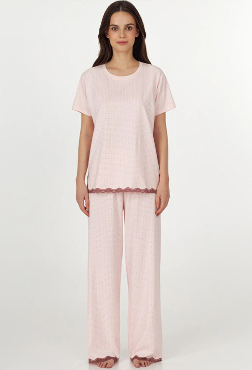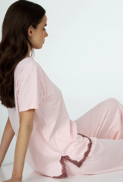 Комфортна жіноча піжама з колекції Sherry від українського бренду Ellen. Піжама виконана з якісної та м'якої бавовни, рожевого кольору в графітовий точковий принт, складається з футболки та штанів вільного силуету. Футболка з короткими рукавами та круглим вирізом горла, з боків оброблена розрізами, внизу та на розрізах прикрашена коричневим мереживом. Штани з високою посадкою та м'якою гумкою в поясі, внизу оздоблені вставками з ажурного мережива коричневого кольору. Піжама дуже красива і зручна, може бути чудовим одягом для дому або корисним подарунком коханій та близькій людині.