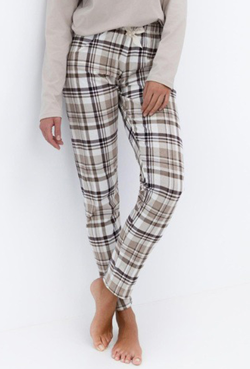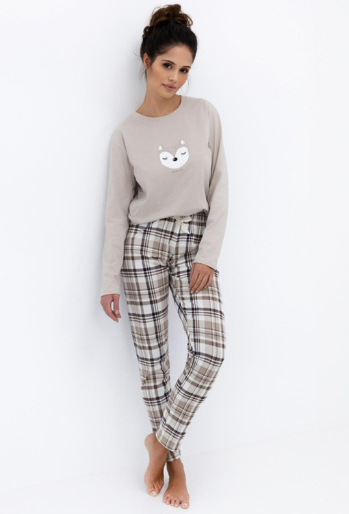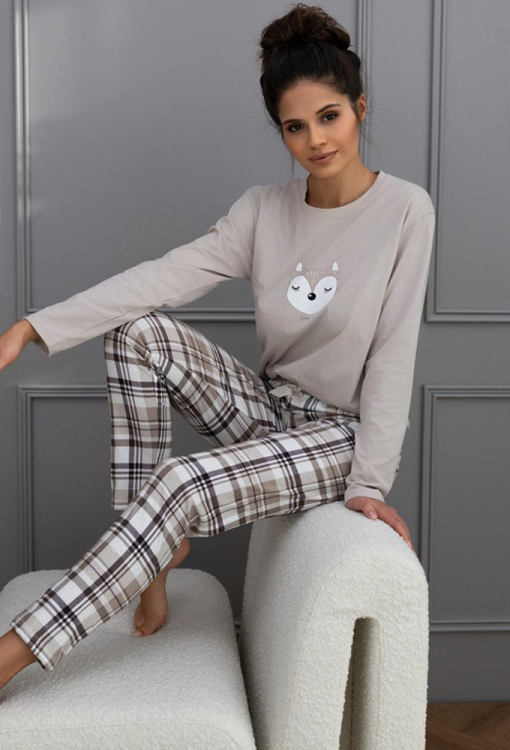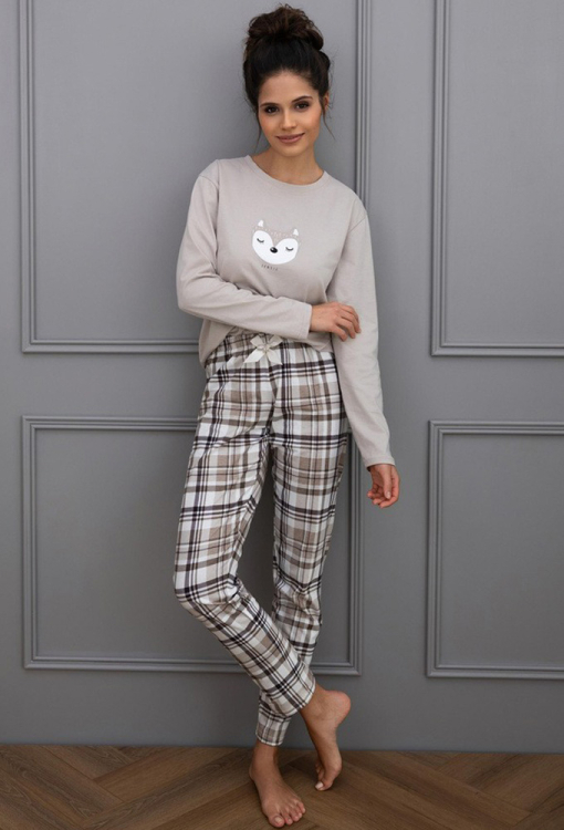 Стильна жіноча піжама Tinsley від польського бренду Sensis. Піжама виконана з якісної та м'якої бавовни сірого кольору, складається з однотонної кофти прямого силуету та штанів у коричневий картатий принт. Кофта з довгими рукавами та акуратним круглим вирізом, спереду прикрашена принтом у вигляді милого звірка – ідеальний варіант для затишних домашніх моментів. Штани прямого крою, з м'якою гумкою в поясі та витонченим атласним бантиком на талії, що надає образу делікатної жіночності. Піжама не тільки приваблива і неймовірно комфортна - вона легко стає улюбленим домашнім комплектом та відмінним подарунком для коханої чи близької людини.