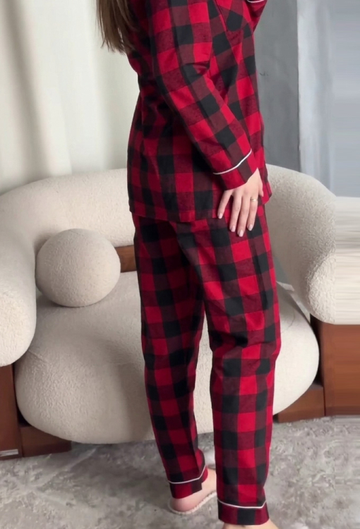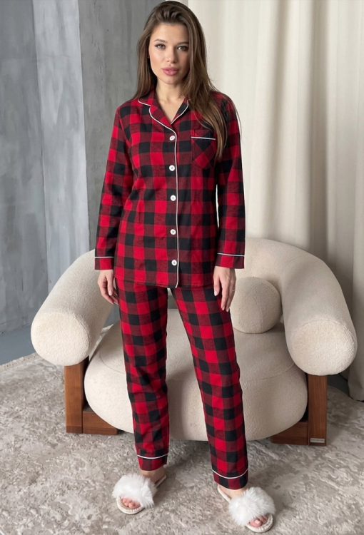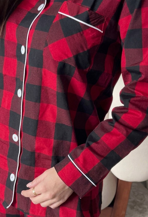 Стильна жіноча піжама від українського бренду Tomiko. Піжама виконана з м'якої та якісної сумішевої бавовни з віскозою червоного кольору в чорний картатий принт складається з сорочки та штанів прямого силуету. Сорочка з довгими рукавами та відкладним коміром, застібається на ґудзики. На грудях зліва модель прикрашена накладною кишенькою, комір, полиці, рукави та кишеня оброблені тонким кантом білого кольору. Штани зі зручною посадкою та м'якою гумкою у поясі, внизу прикрашені тонким білим кантом. Піжама красива і дуже комфортна, ідеальна для сну та домашнього відпочинку, а також може бути чудовим подарунком коханій або близькій людині.