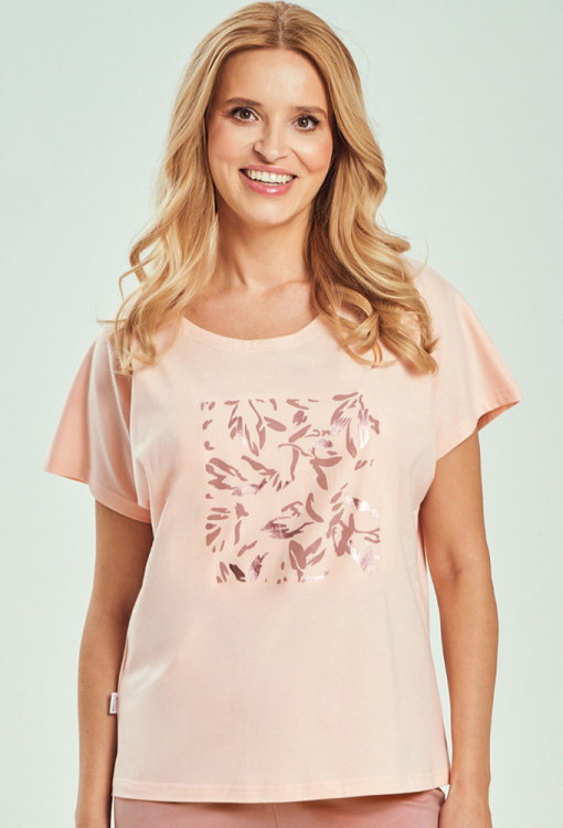 Стильна жіноча піжама Valentine від польського бренду Taro. Піжама виконана з якісної та м'якої бавовни, складається з футболки абрикосового кольору та темно-рожевих бриджів. Футболка прямого силуету, з короткими рукавами й круглим вирізом горла, спереду прикрашена принтом з листя в тон бридж. Бриджі зі зручною посадкою та м'якою гумкою в поясі. Піжама дуже красива та комфортна, ідеальна для приємного сну та затишного домашнього відпочинку, а також може бути чудовим подарунком коханій чи близькій людині.