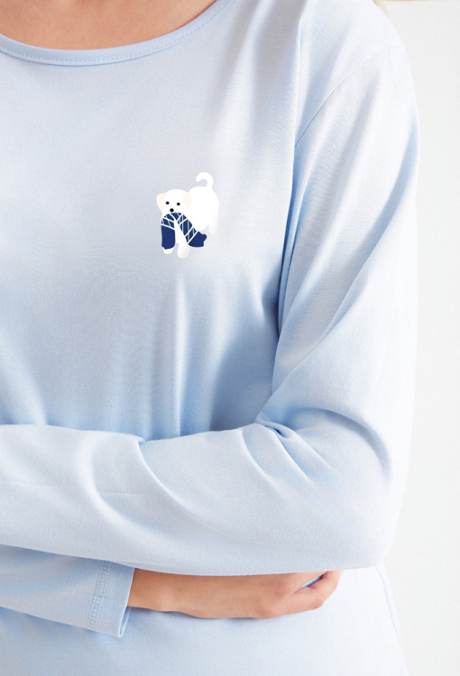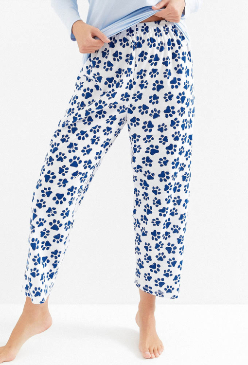 Зручна жіноча піжама Zola від польського бренду Taro. Піжама виконана з якісної та м'якої бавовни, складається з кофти блакитного кольору та білих штанів із синім принтом у вигляді слідів. Кофта з довгими рукавами та круглим вирізом горла, вгорі зліва прикрашена ніжним принтом із білого песика з шарфом. Штани прямого крою, зі зручною посадкою та м'якою гумкою в поясі. Піжама дуже красива та комфортна, ідеальна для прохолодних вечорів та ночей, а також може бути чудовим подарунком коханій чи близькій людині.