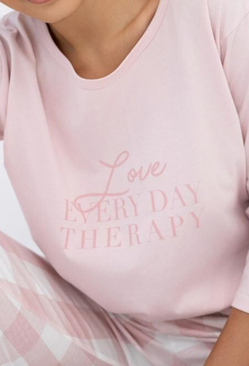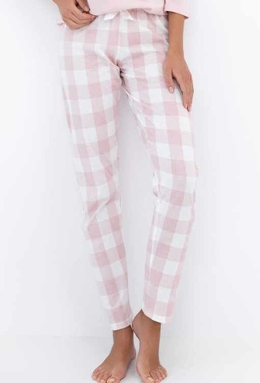 Ніжна жіноча піжама Annabelle від польського бренду Sensis. Піжама виконана з високоякісного, м'якого і приємного до тіла матеріалу пудрового кольору, він поєднує комфорт і ніжну естетику. Складається комплект з однотонної бавовняної кофти прямого силуету та фланелевих штанів у білий картатий принт. Кофта з рукавами 3/4 та акуратним круглим вирізом, спереду прикрашена принтом з напису - ідеальний варіант для затишних домашніх вечорів. Штани також прямого крою та з м'якою гумкою в поясі, на талії прикрашені витонченим атласним бантиком, що надає образу делікатної жіночності. Піжама не тільки приваблива і неймовірно комфортна - вона легко стає улюбленим домашнім комплектом та відмінним подарунком для коханої чи близької людини.