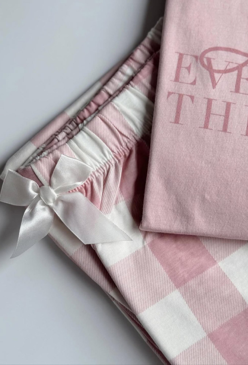 Ніжна жіноча піжама Annabelle від польського бренду Sensis. Піжама виконана з високоякісного, м'якої та приємної до тіла бавовни пудрового кольору, він поєднує комфорт і ніжну естетику. Складається комплект з однотонної кофти прямого силуету та штанів із щільної бавовни у білий картатий принт. Кофта з рукавами 3/4 та акуратним круглим вирізом, спереду прикрашена принтом з напису - ідеальний варіант для затишних домашніх вечорів. Штани виконані в злегка звуженому до низу крої та з м'якою гумкою в поясі, на талії прикрашені витонченим атласним бантиком, що надає образу делікатної жіночності. Піжама не тільки приваблива і неймовірно комфортна - вона легко стає улюбленим домашнім комплектом та відмінним подарунком для коханої чи близької людини.