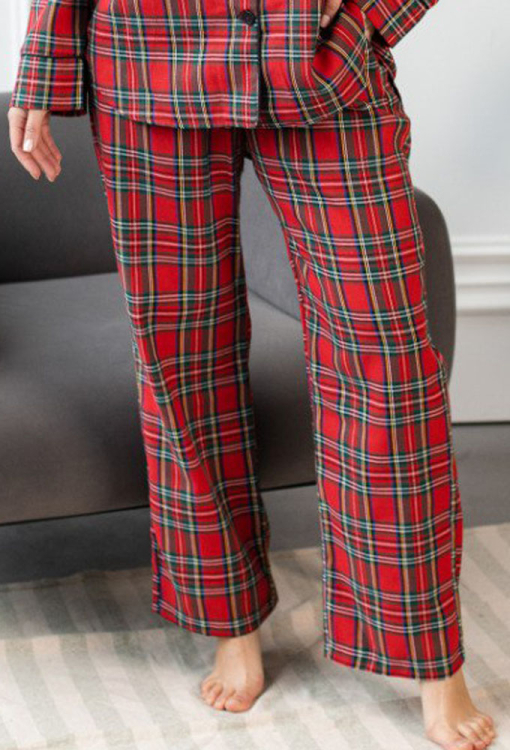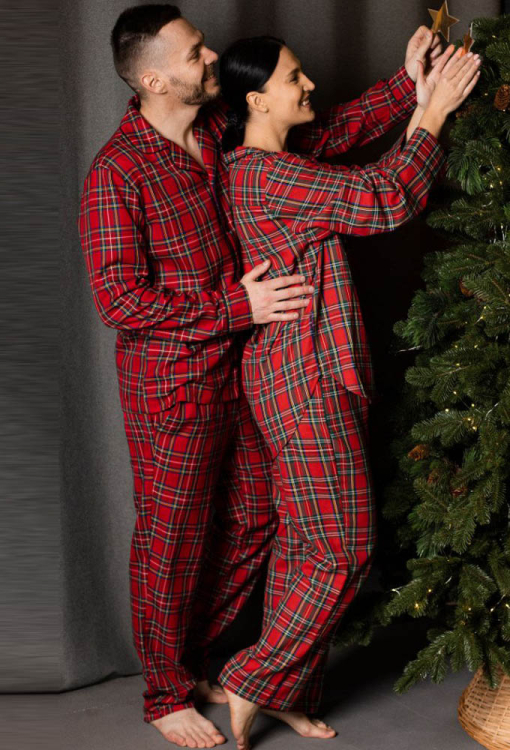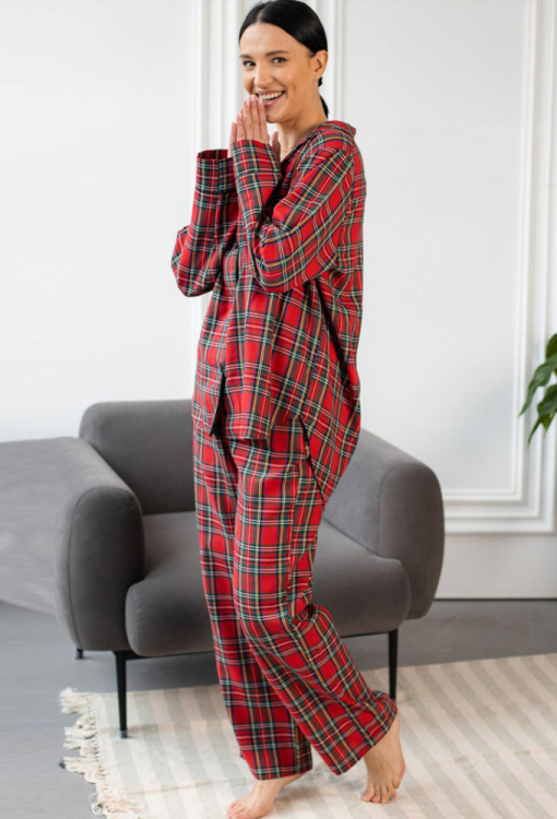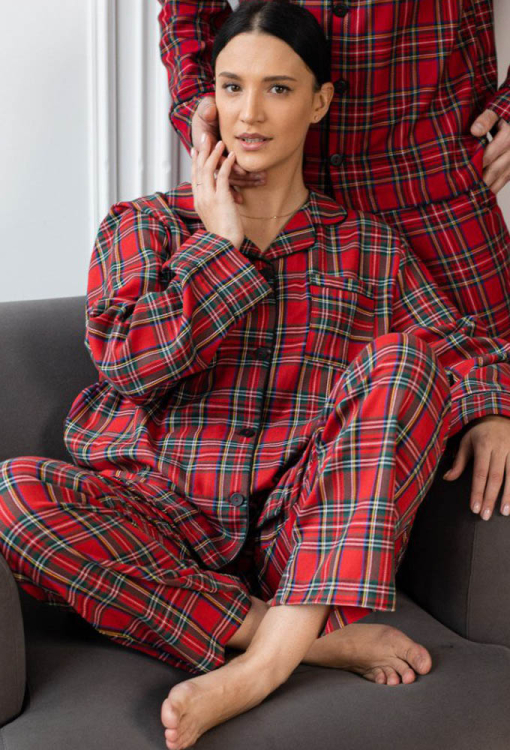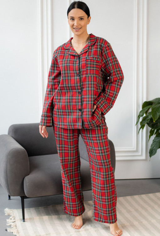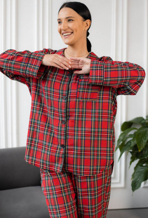 Яскрава жіноча зимова піжама від українського бренду BO.Brand. Піжама виконана з якісної та м'якої фланелі, червоного кольору в синій картатий принт, складається з сорочки зі штанами вільного силуету. Сорочка з довгими рукавами і відкладним коміром, застібається на ґудзики. Рукави оброблені вільними манжетами, на грудях зліва модель прикрашена маленькою накладною кишенькою. Штани з м'якою гумкою в поясі та зручними бічними кишенями. Піжама стильна і дуже комфортна, ідеальна для сну та домашнього відпочинку, а також може бути чудовим подарунком коханій та близькій людині.