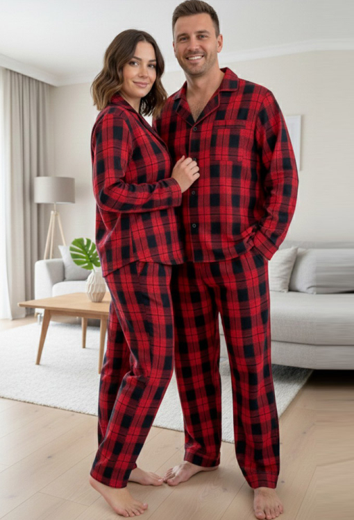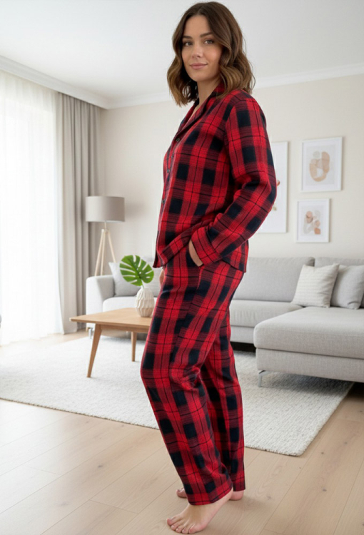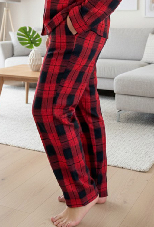 Елегантна жіноча зимова піжама від українського бренду Cosy. Піжама виконана з високоякісної та м'якої фланелі, червоного кольору в синій картатий принт, складається з сорочки та штанів прямого силуету. Сорочка з довгими рукавами та відкладним коміром, застібається на ґудзики, рукави оброблені вільними манжетами. Штани з м'якою гумкою в поясі та зручними бічними кишенями, регулюються по ширині за допомогою внутрішнього шнурка. Піжама дуже красива і комфортна, також може бути чудовим подарунком коханій та близькій людині.
