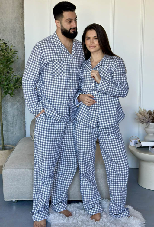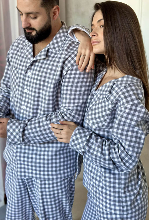 Жіноча зимова піжама Harmony від українського бренду Cosy. Піжама виконана з якісної та м'якої фланелі, сірого кольору з білим картатим принтом, складається з сорочки та штанів. Сорочка прямого силуету, з довгими рукавами та відкладним коміром, застібається на ґудзики. На грудях зліва модель прикрашена маленькою накладною кишенькою, рукави оброблені вільними манжетами. Штани також прямого крою, з м'якою гумкою в поясі та вільними манжетами внизу. Піжама дуже красива та комфортна, ідеальна для приємного релаксу після насиченого дня, також може бути чудовим подарунком коханій та близькій людині.