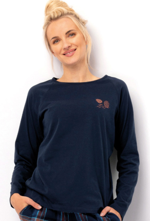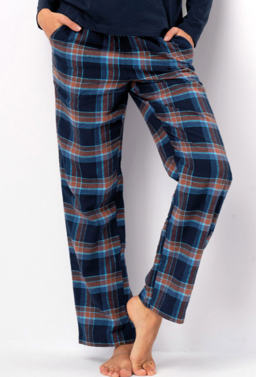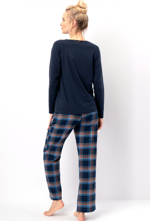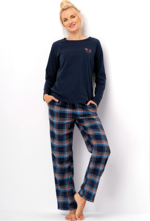 Стильна жіноча піжама від польського бренду Key. Піжама виконана з якісного та м'якого матеріалу, складається з бавовняної кофти темно-синього кольору та фланелевих штанів у картатий принт темно-синього та коричневого кольору. Кофта прямого крою, з круглим вирізом горла та довгими рукавами, вгорі зліва прикрашена ніжним принтом. Штани прямого крою, з м'якою гумкою в поясі та зручними бічними кишенями. Піжама дуже красива та комфортна, ідеальна не тільки для зимових ночей, але і як зручний одяг для домашнього відпочинку, також може бути корисним подарунком коханій та близькій людині.