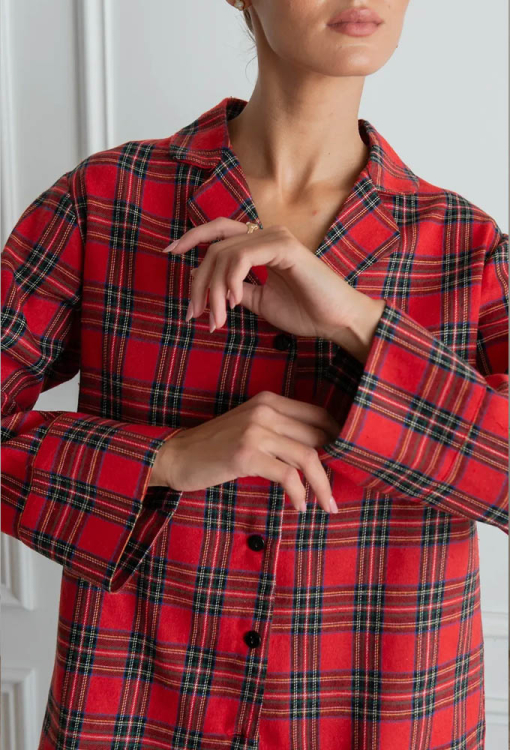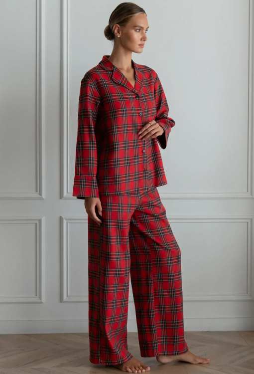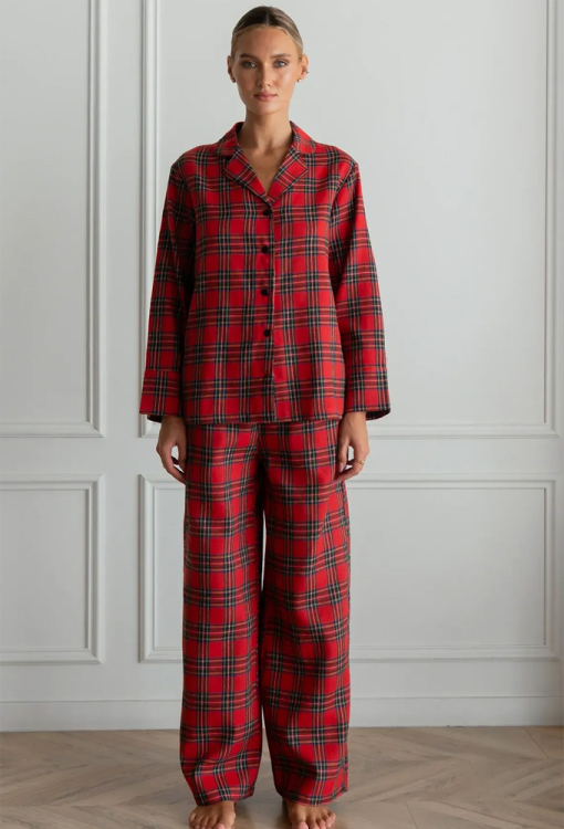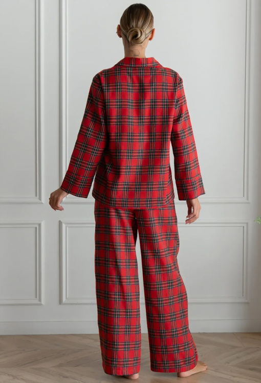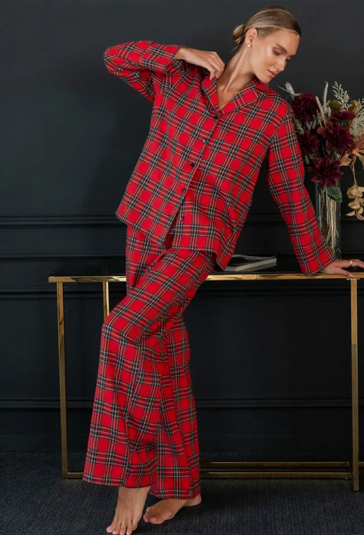 Класична жіноча піжама Present від українського бренду Forly. Піжама виконана з якісної та м'якої фланелі, червоного кольору в синій картатий принт, складається з сорочки вільного силуету та широких штанів. Сорочка з довгими рукавами на манжетах та відкладним коміром, застібається на ґудзики. Штани з м'якою гумкою в поясі та зручними бічними кишенями, внизу оброблені вільними манжетами. Піжама дуже красива, тепла і комфортна, ідеальна на холодну пору року, а також може бути корисним подарунком коханій та близькій людині.