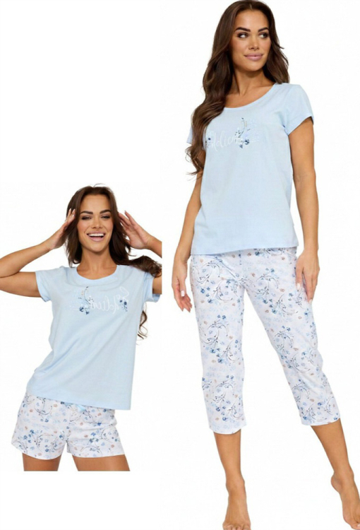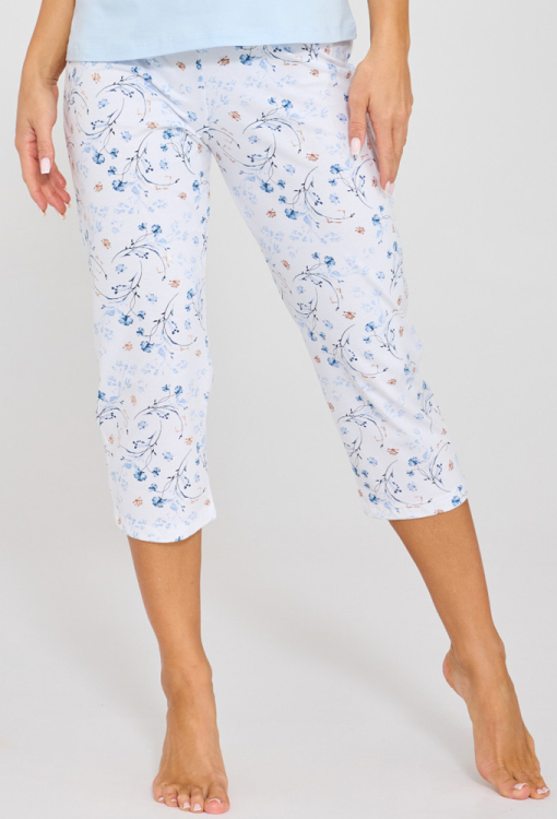 Стильна жіноча піжама комплект So Delicate від польського бренду Cornette. Комплект виконаний з якісної та м'якої бавовни, складається з футболки блакитного кольору, бридж та шорт білого кольору у блакитний квітковий принт. Футболка прямого силуету, з короткими рукавами та круглим вирізом горла, на грудях по центру прикрашена ніжним квітковим принтом та написом "So Delicate". Бриджі та шорти прямого крою, з м'якою гумкою в поясі та блакитним атласним бантиком на талії. Комплект красивий і дуже комфортний, також може бути чудовим подарунком коханій та близькій людині.