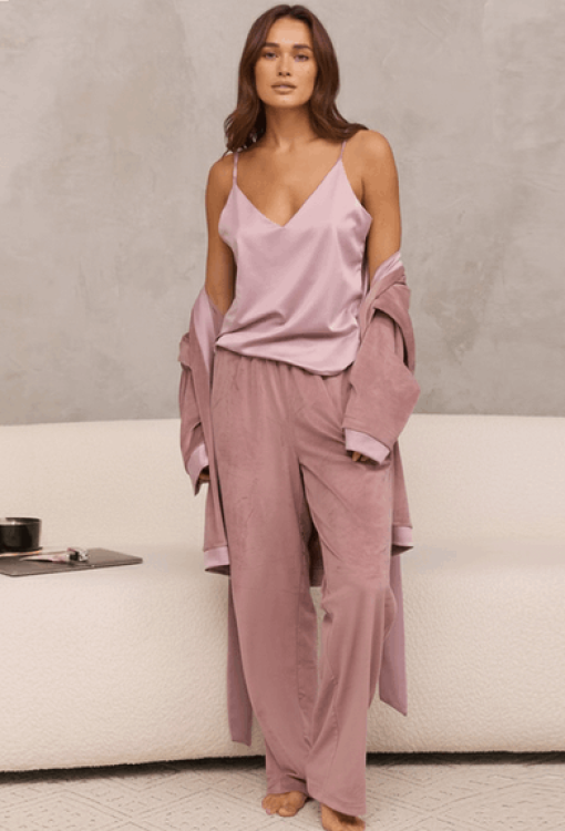 Чудова жіноча піжама від українського бренду DaLi. Піжама виконана з якісного та м'якого матеріалу, рожевого кольору, складається з плюшевого жакета зі штанами та майки зі штучного шовку. Жакет вільного крою та з довгими рукавами, зав'язується на запах за допомогою пояса. Виріз, полиці, рукави та низ прикрашені шовковими вставками рожевого кольору. Штани прямого крою, з м'якою гумкою в поясі та зручними бічними кишенями. Піжама красива й дуже комфортна, дозволить почуватися впевнено в домашній обстановці, а також може бути чудовим подарунком коханій та близькій людині.