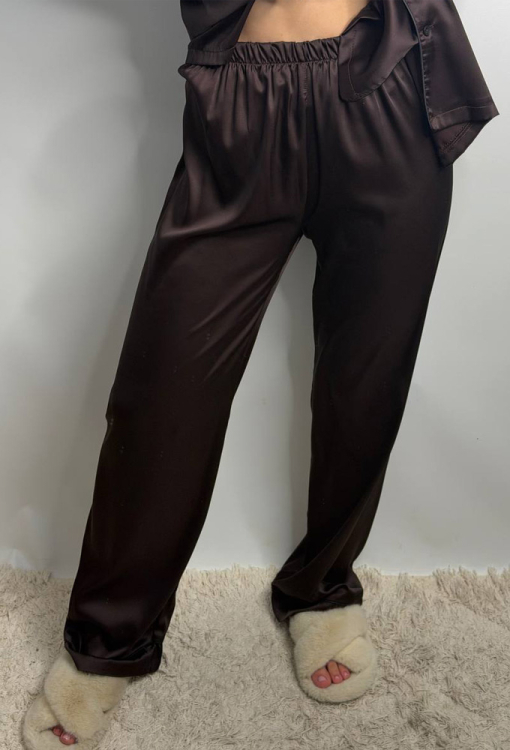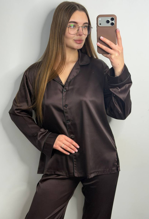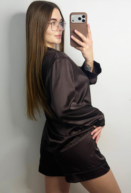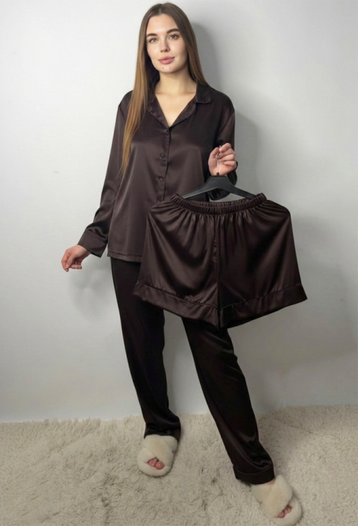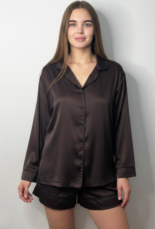Зручна жіноча піжама комплект від українського бренду V.Velika. Комплект виконаний з якісного та м'якого шовку Армані коричневого кольору, складається з сорочки, штанів та шортів вільного силуету. Сорочка з довгими рукавами, відкладним коміром і невеликими розрізами внизу, застібається на ґудзики. Комір, полиці та рукави моделі прикрашені тонким кантом чорного кольору. Штани та шорти з високою посадкою та м'якою гумкою в поясі, внизу оформлені контрастним кантом. Піжамний комплект неймовірно красивий і комфортний, ідеальний як для сну, так і для затишного домашнього відпочинку або подарунка коханій та близькій людині.