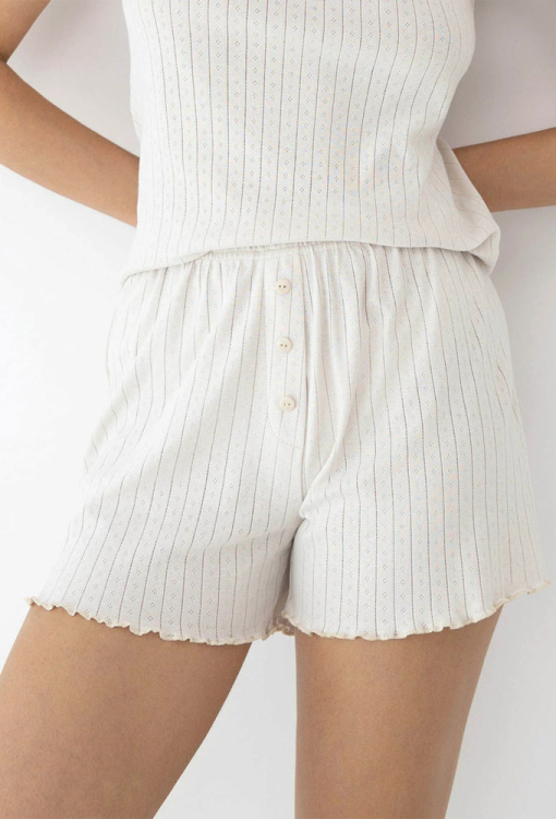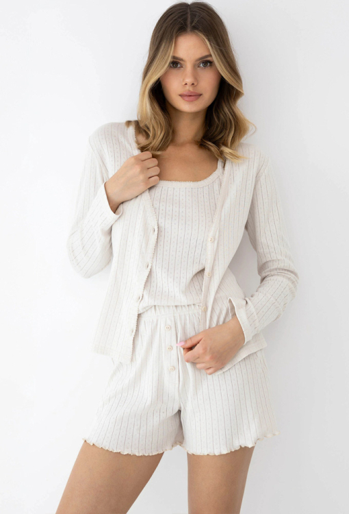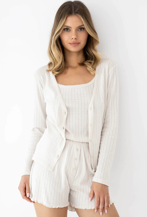 Стильна жіноча піжама комплект Jaylani від польського бренду Sensis. Комплект виконаний з якісного та м'якого трикотажу з ажурною фактурою кремового кольору, складається з майки, шортів та жакета прямого силуету. Майка з тонкими регульованими бретелями та круглим декольте, шорти з м'якою гумкою в поясі та хвилястою обробкою внизу, спереду прикрашені трьома ґудзиками. Жакет з довгими рукавами та V-подібним вирізом горла, застібається на ґудзики. Комплект красивий і неймовірно комфортний, ідеальний варіант для сну та затишного домашнього відпочинку, а також може бути корисним подарунком коханій або близькій людині.