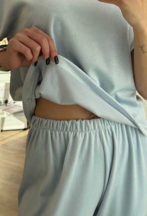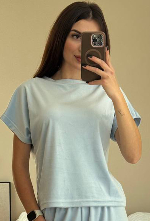 Комфортна жіноча піжама комплект від українського бренду V.Velika. Комплект виконаний з якісного та м'якого велюру блакитного кольору, складається з футболки прямого силуету, трохи звужених до низу штанів та коротких шортів. Футболка з короткими рукавами та круглим вирізом горла, штани та шорти зі зручною посадкою та м'якою гумкою у поясі. Штани внизу оброблені вільними манжетами, шорти закругленими розрізами. Комплект неймовірно красивий та зручний, ідеальний як для сну, так і для домашнього відпочинку чи подарунка коханій та близькій людині.