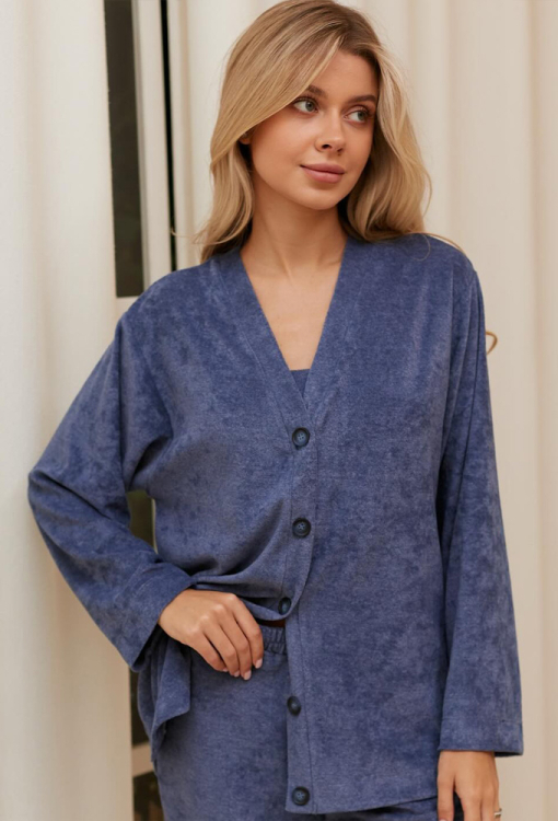 Стильна жіноча піжама комплект із колекції Velour від українського бренду Your Touch. Комплект виконаний з м'якого та якісного велюру синього кольору, складається з жакета з довгими рукавами, топа прилеглого силуету та штанів прямого крою. Жакет вільного силуету та з V-подібним вирізом горла, застібається на ґудзики. Топ на тонких бретелях, що регулюються і з широким декольте, внизу оброблений манжетою. Штани зі зручною посадкою та м'якою гумкою в поясі, внизу з боків прикрашені закругленими розрізами. Комплект дуже гарний та зручний, ідеальний для сну та домашнього відпочинку, а також може бути чудовим подарунком коханій та близькій людині.
