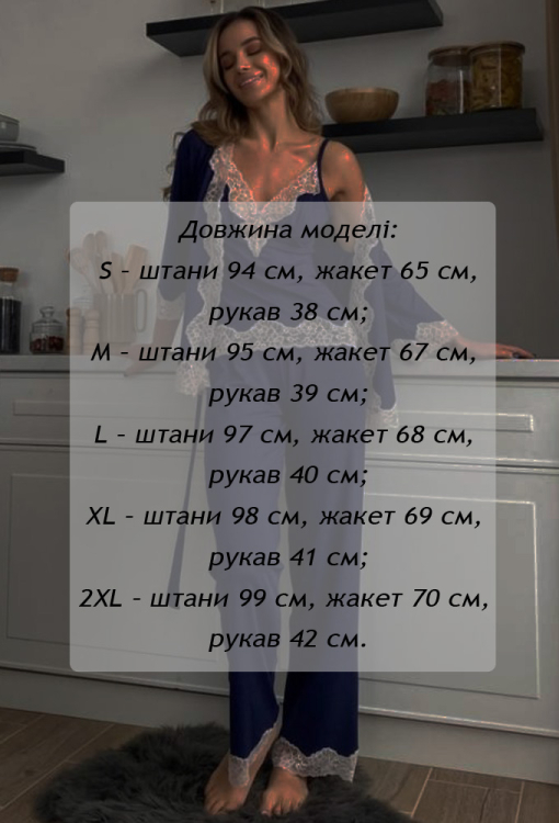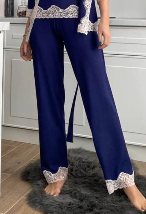 Розкішна жіноча піжама комплект від українського бренду Violet delux. Комплект виконаний з м'якої та якісної віскози синього кольору, складається з жакета з рукавами 3/4, майки на тонких бретелях, що регулюються, і вільних штанів. Жакет зав'язується на запах за допомогою пояса, на бортах, рукавах і знизу прикрашений вставками з ажурного мережива ніжно-рожевого кольору. Майка напівприлеглого силуету та з глибоким V-подібним декольте, внизу та по лінії вирізу прикрашена рожевим мереживом. Штани прямого крою та з м'якою гумкою в поясі, внизу оброблені мереживом. Комплект дуже красивий і комфортний, ідеальний для сну та домашнього відпочинку, а також може бути чудовим подарунком коханій та близькій людині.