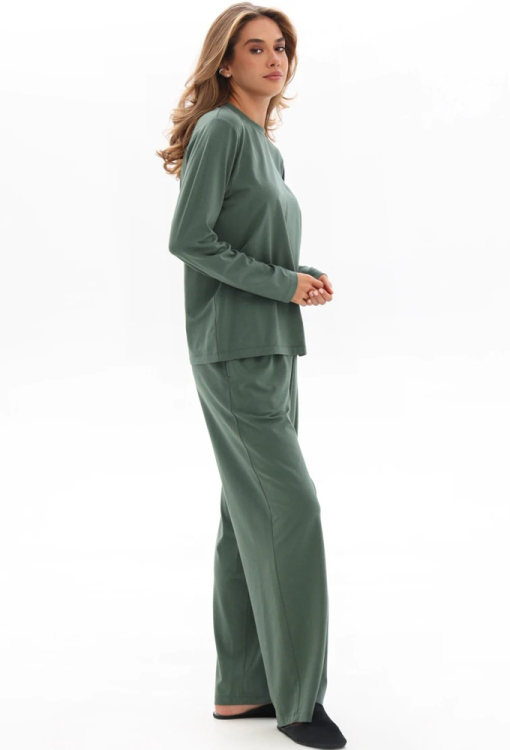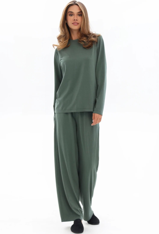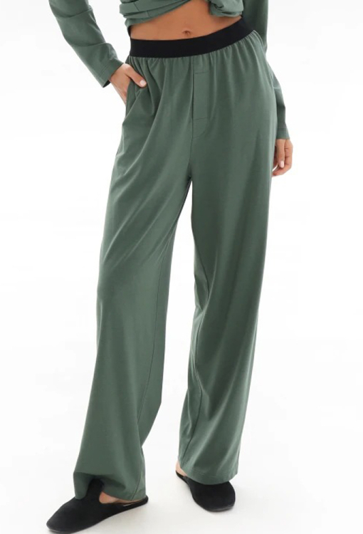 Стильна жіноча піжама від українського бренду German Volf. Піжама виконана з якісного та м'якого модалу зеленого кольору, складається з кофти та штанів силуету oversize. Кофта з довгими рукавами та круглим вирізом горла, обробленим кантом. Штани із широким еластичним поясом чорного кольору та зручними бічними кишенями. Піжама красива і дуже комфортна, також може бути чудовим подарунком коханій дівчині чи жінці.