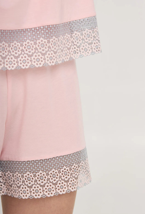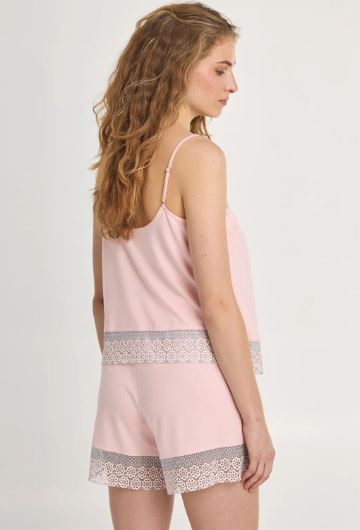 Чарівна жіноча піжама із колекції Katherine від українського бренду Ellen. Піжама виконана з якісного та м'якого модалу рожевого кольору, складається з майки вільного крою та коротких шортів. Майка на тонких бретелях, що регулюються, з прямокутним декольте і круглим вирізом на спині. По лінії декольте модель оброблена м'якими складками та широкою мереживною вставкою, низ також прикрашений мереживом. Шорти прямого крою, зі зручною посадкою та м'якою гумкою в поясі, внизу оброблені широкими вставками з ажурного мережива сірого кольору. Піжама дуже красива і комфортна, стане улюбленим одягом для сну та домашнього відпочинку або чудовим подарунком коханій або близькій людині.