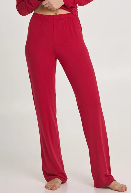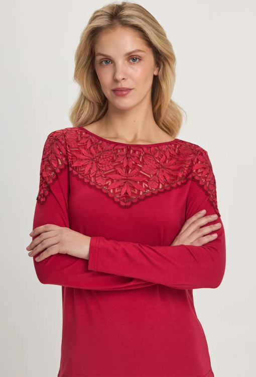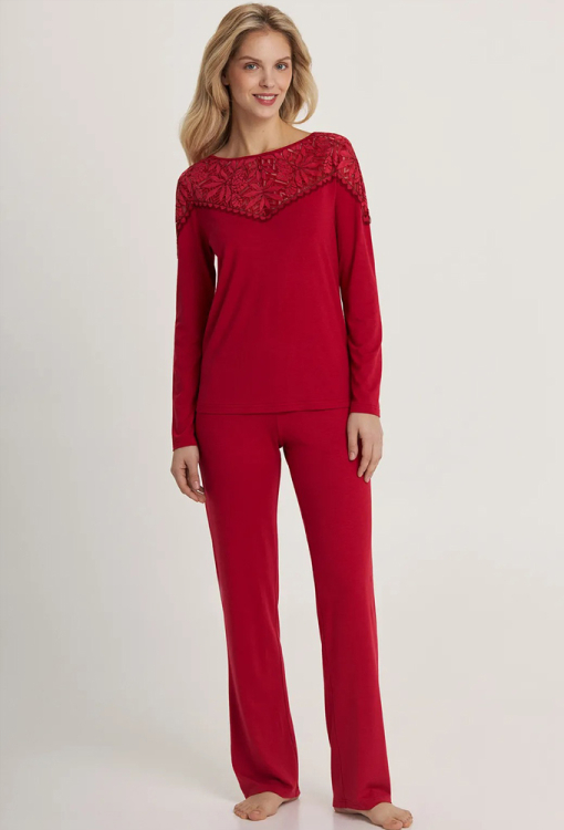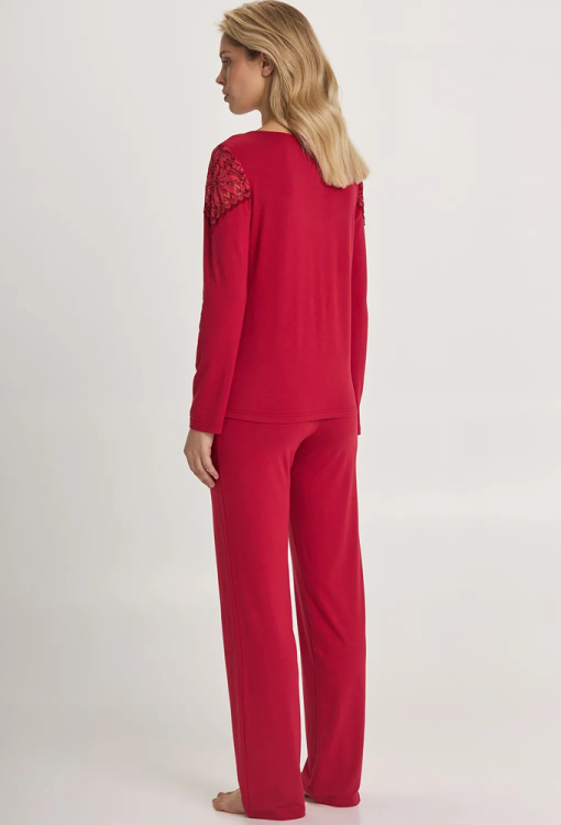 Яскрава жіноча піжама із колекції Margaret від українського бренду Ellen. Піжама виконана з якісного та м'якого модалу червоного кольору, складається з кофти зі штанами прямого силуету. Кофта з довгими рукавами та круглим вирізом горла, вгорі прикрашена широкою фігурною вставкою з ажурного мережива. Штани зі зручною посадкою та м'якою гумкою в поясі. Піжама дуже красива і комфортна, стане улюбленим одягом для сну та домашнього відпочинку або чудовим подарунком коханій або близькій людині.
