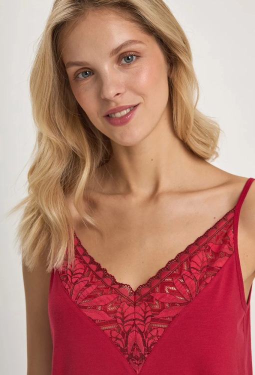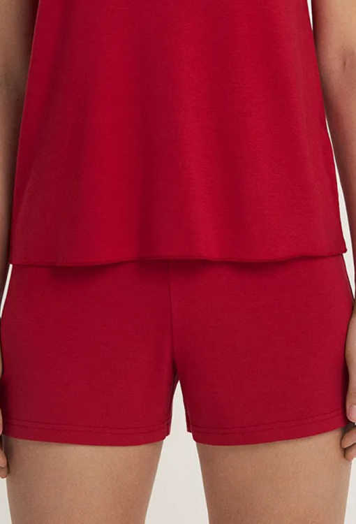 Легка яскрава жіноча піжама із колекції Margaret від українського бренду Ellen. Піжама виконана з якісного та м'якого модалу червоного кольору, складається з майки прямого силуету та коротких шортів. Майка з тонкими регульованими бретелями, V-подібним декольте та таким же вирізом на спині, по лінії вирізу спереду та на спинці прикрашена вставками з ажурного мережива. Шорти зі зручною посадкою та м'якою гумкою в поясі. Піжама дуже красива і комфортна, стане улюбленим одягом для сну та домашнього відпочинку або чудовим подарунком коханій або близькій людині.