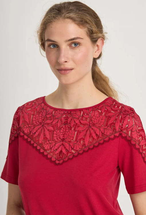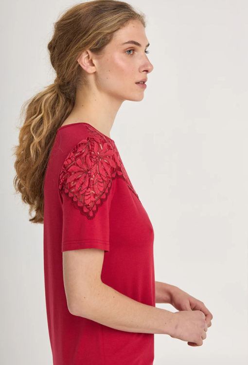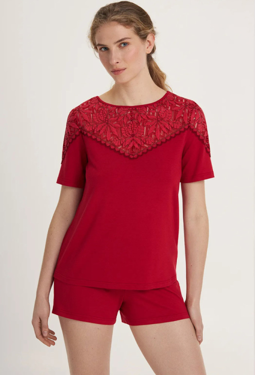 Зручна яскрава жіноча піжама із колекції Margaret від українського бренду Ellen. Піжама виконана з якісного та м'якого модалу червоного кольору, складається з футболки прямого силуету та коротких шортів. Футболка з короткими рукавами та круглим вирізом горла, вгорі та прикрашена широкою фігурною вставкою з ажурного мережива. Шорти зі зручною посадкою та м'якою гумкою в поясі. Піжама дуже красива і комфортна, стане улюбленим одягом для сну та домашнього відпочинку або чудовим подарунком коханій або близькій людині.