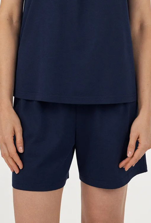Елегантна жіноча піжама із колекції Paola від українського бренду Ellen. Піжама виконана з якісного та м'якого модалу синього кольору, складається з майки та шорт вільного силуету. Майка з широкими бретелями, круглим вирізом горла та розрізами з боків, вгорі прикрашена кокеткою з мережива з квітковим мотивом. Шорти зі зручною посадкою та м'якою гумкою в поясі. Піжама стильна і дуже комфортна, в ній не тільки приємно спати, але і насолоджуватися домашнім комфортом, також можна використовувати як подарунок коханій або близькій людині.