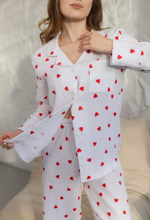 Ніжна та романтична жіноча піжама від українського бренду BO.Brand. Піжама виконана з якісного та м'якого двошарового мусліну, білого кольору в принт з червоних сердечок, складається з сорочки прямого силуету та вільних штанів. Сорочка з довгими рукавами на вільних манжетах та відкладним коміром, застібається на ґудзики, на грудях зліва прикрашена маленькою кишенькою. Штани зі зручною посадкою та м'якою гумкою в поясі, регулюються по ширині за допомогою внутрішнього шнурка. Піжама красива і дуже комфортна, ідеальна для сну та домашнього відпочинку, а також може бути чудовим подарунком коханій та близькій людині.