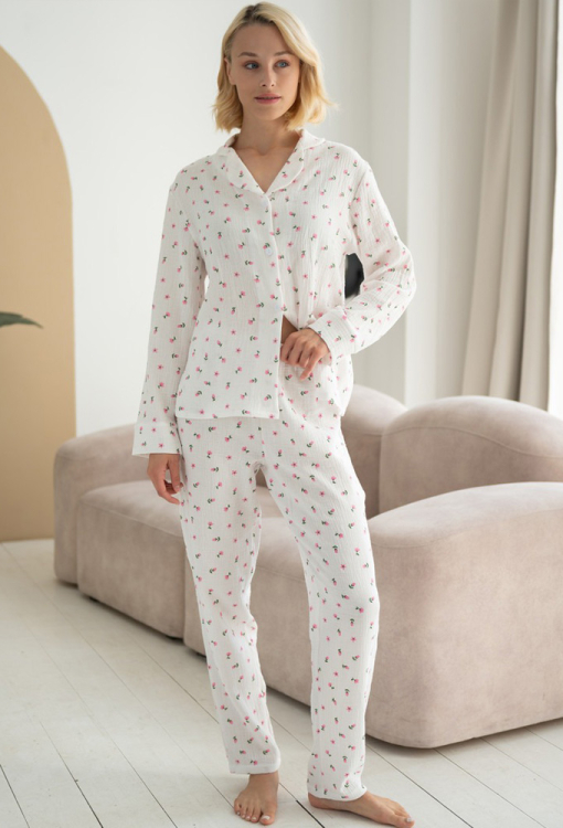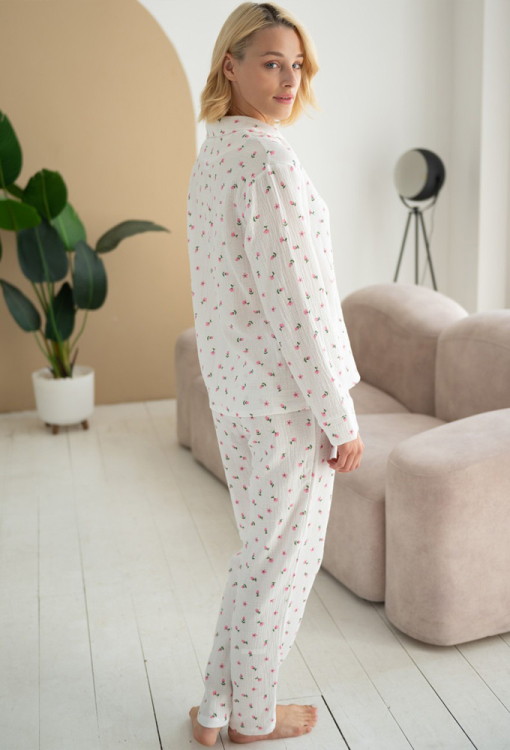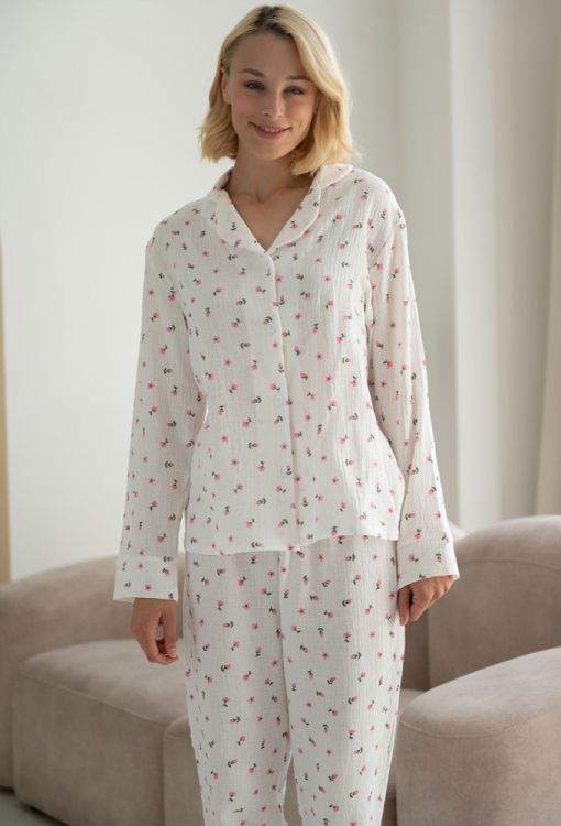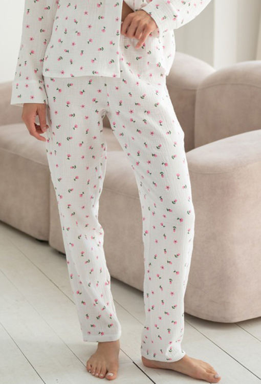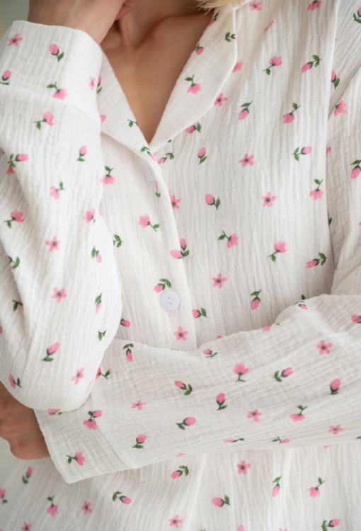 Ніжна та приємна до тіла жіноча піжама від українського бренду LoomLine. Піжама виконана з якісного та м'якого двошарового мусліну, білого кольору в принт із рожевих тюльпанів, складається з сорочки та штанів. Сорочка прямого силуету, з довгими рукавами та відкладним коміром, застібається на ґудзики, рукави оброблені вільними манжетами. Штани прямого крою та з м'якою гумкою в поясі. Піжама красива і дуже комфортна, ідеальна для сну та домашнього відпочинку, а також може бути чудовим подарунком коханій та близькій людині.