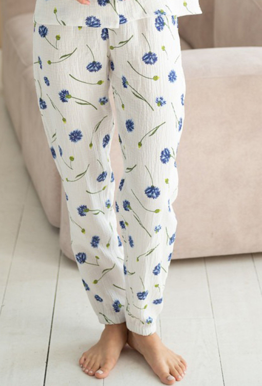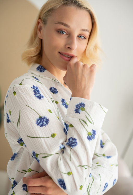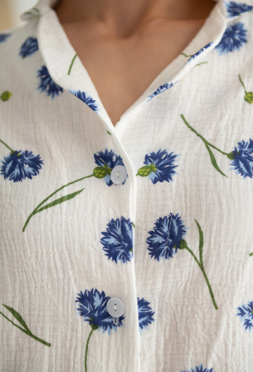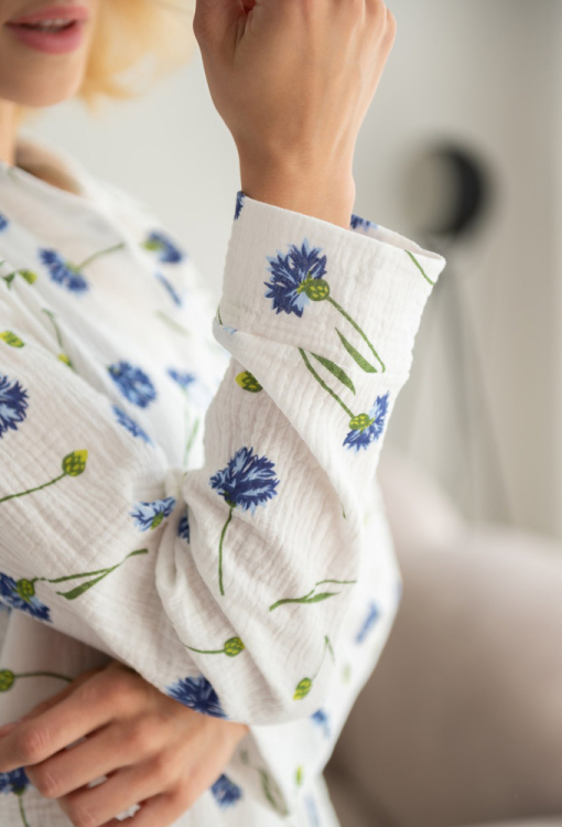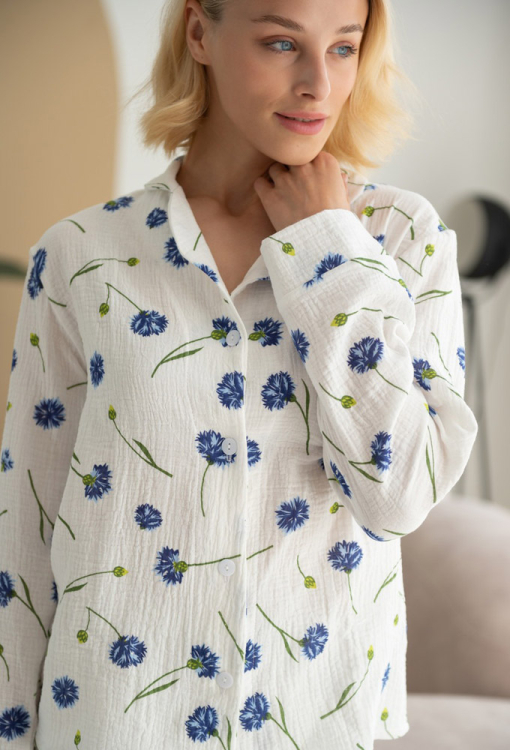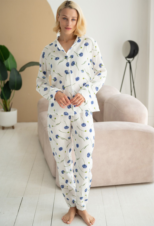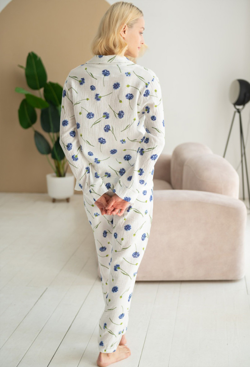 Ніжна та приємна до тіла жіноча піжама від українського бренду LoomLine. Піжама виконана з якісного та м'якого двошарового мусліну, білого кольору в принт із синіх волошок, складається з сорочки та штанів. Сорочка прямого силуету, з довгими рукавами та відкладним коміром, застібається на ґудзики, рукави оброблені вільними манжетами. Штани з м'якою гумкою в поясі, внизу оброблені еластичними манжетами. Піжама красива і дуже комфортна, ідеальна для сну та домашнього відпочинку, а також може бути чудовим подарунком коханій та близькій людині.