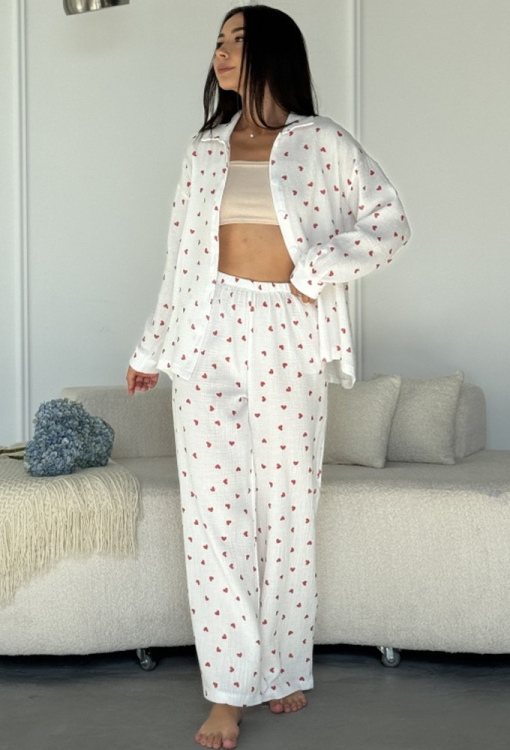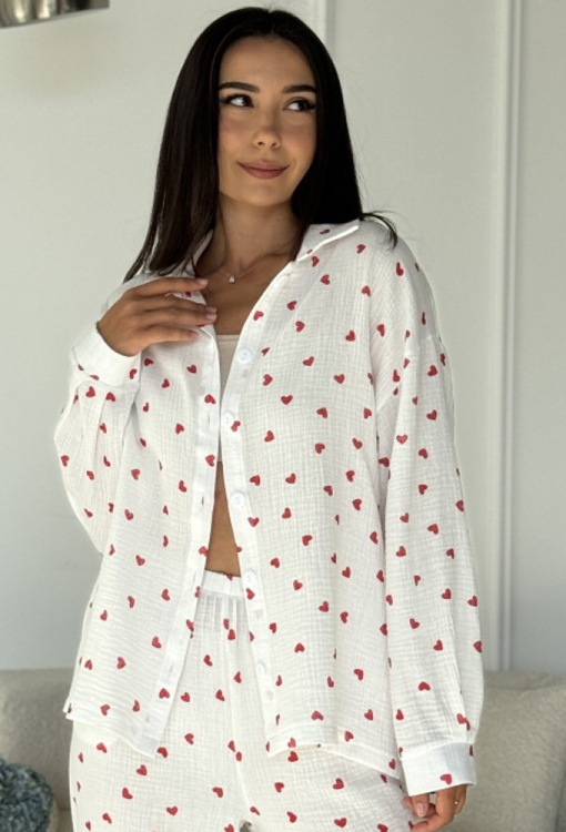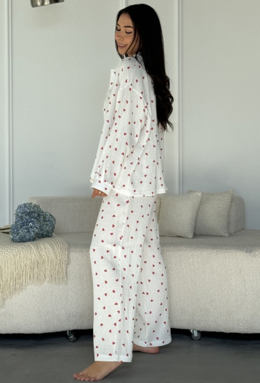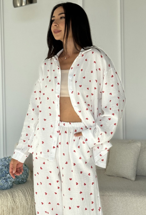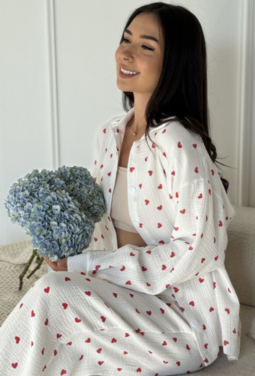 Романтична жіноча піжама від українського бренду Marinella. Піжама виконана з якісного та приємного до тіла мусліну, білого кольору в принт червоні серця середнього розміру, складається з сорочки та штанів вільного силуету. Сорочка з довгими рукавами, заниженим плечовим швом і відкладним коміром, застібається на ґудзики, рукави оброблені манжетами. Штани з м'якою гумкою в поясі та зручними бічними кишенями. Піжама стильна та дуже комфортна стане чудовим вибором для сну та домашнього відпочинку, також може бути корисним подарунком близьким людям!