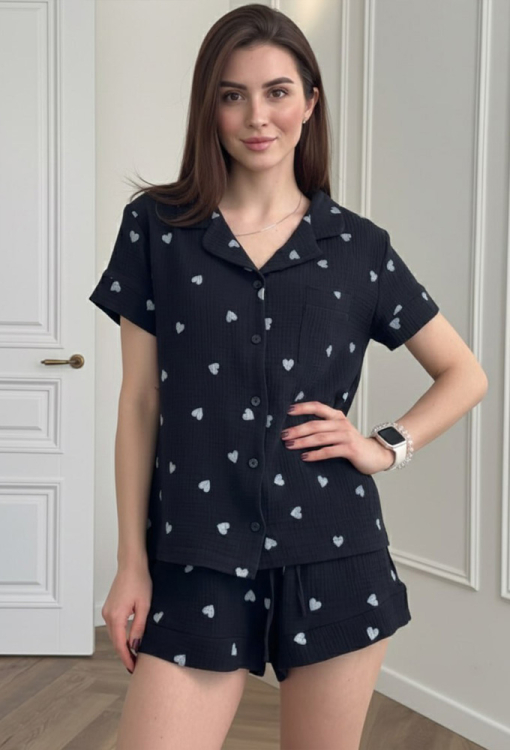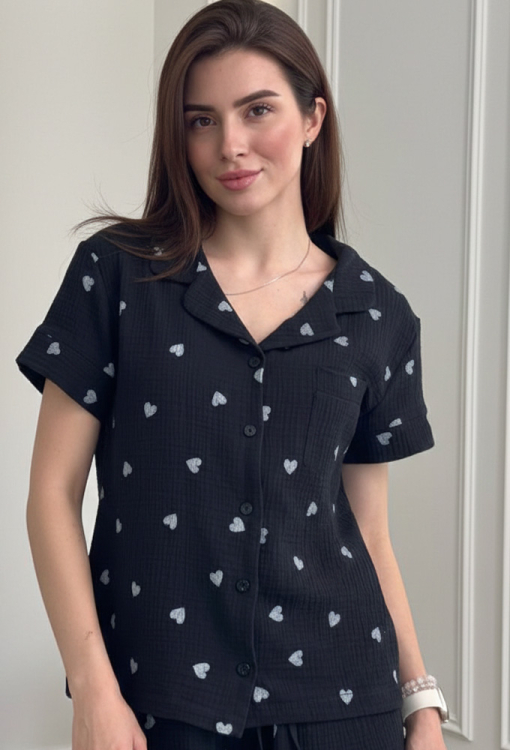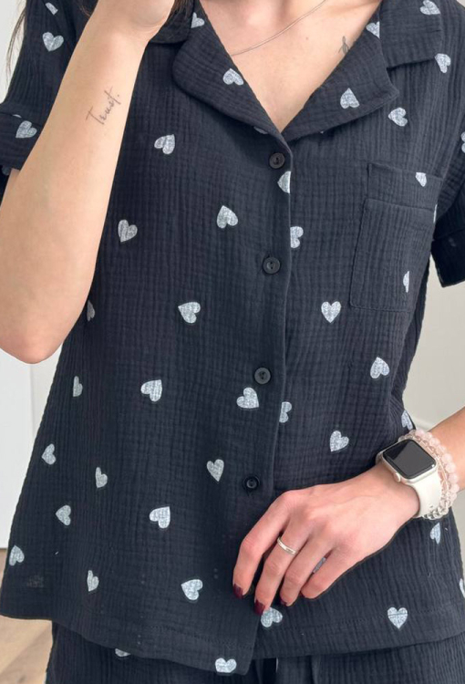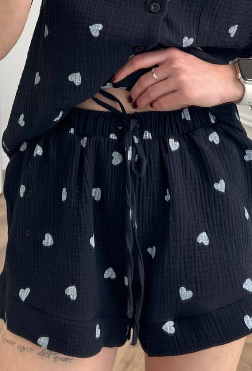 Елегантна жіноча піжама від українського бренду V.Velika. Піжама виконана з м'якого та якісного мусліну, чорного кольору з принтом у вигляді невеликих білих сердечок, складається з сорочки та шорт вільного силуету. Сорочка з короткими рукавами та відкладним коміром, застібається на ґудзики, на грудях зліва прикрашена маленькою накладною кишенькою, рукави оброблені вільними манжетами. Шорти з м'якою гумкою в поясі та широкими манжетами, регулюються по ширині за допомогою внутрішнього шнурка. Піжама дуже красива і комфортна, підійде як домашній одяг, а також може бути відмінним подарунком коханій або близькій людині.