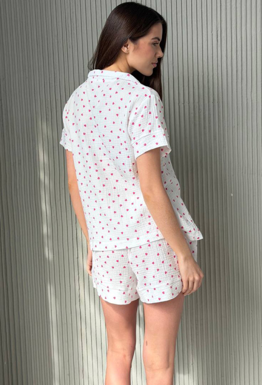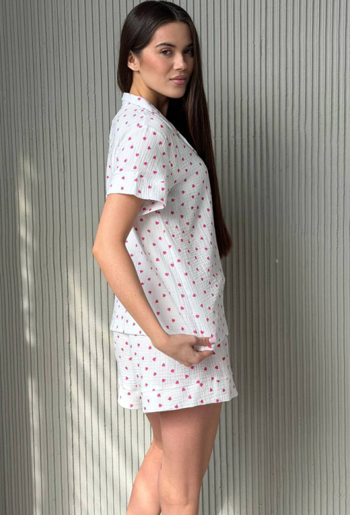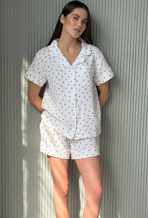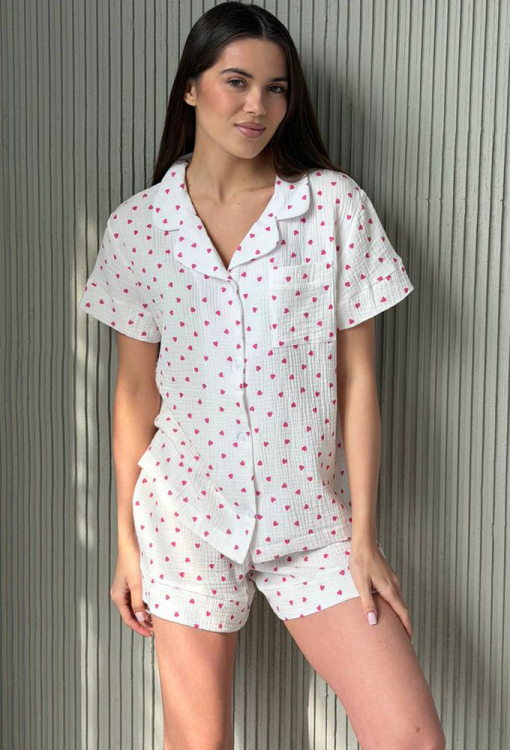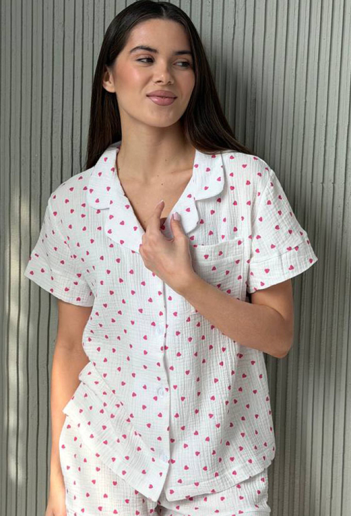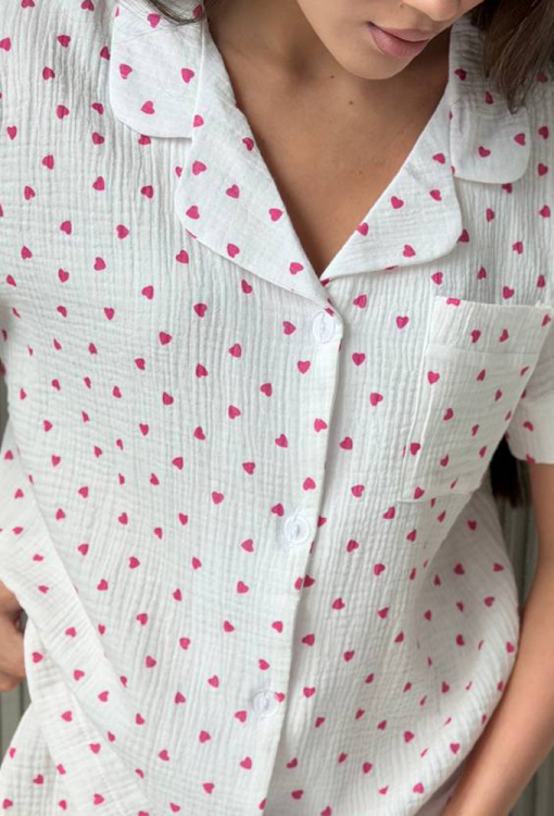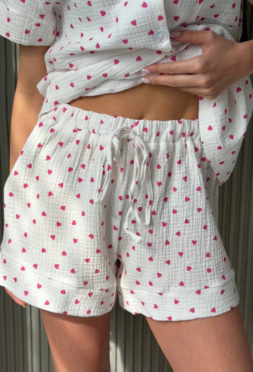 Легка жіноча піжама від українського бренду V.Velika. Піжама виконана з м'якого та якісного мусліну, білого кольору з принтом у вигляді малинових сердечок, складається з сорочки та шорт вільного силуету. Сорочка з короткими рукавами та відкладним коміром, застібається на ґудзики, на грудях зліва прикрашена маленькою накладною кишенькою, рукави оброблені вільними манжетами. Шорти з м'якою гумкою в поясі та широкими манжетами, регулюються по ширині за допомогою внутрішнього шнурка. Піжама дуже красива і комфортна, підійде як домашній одяг, а також може бути відмінним подарунком коханій або близькій людині.