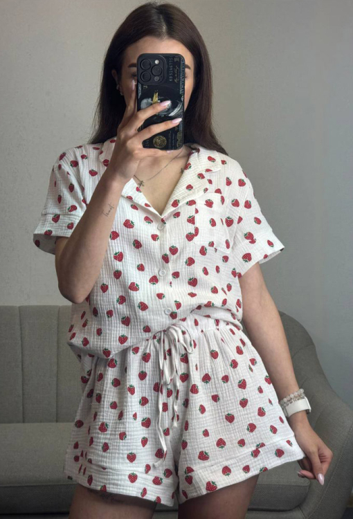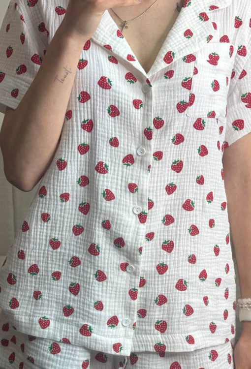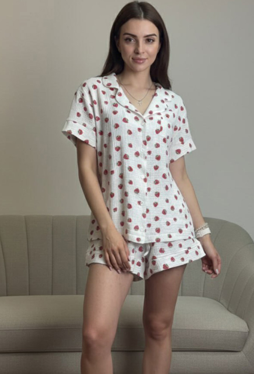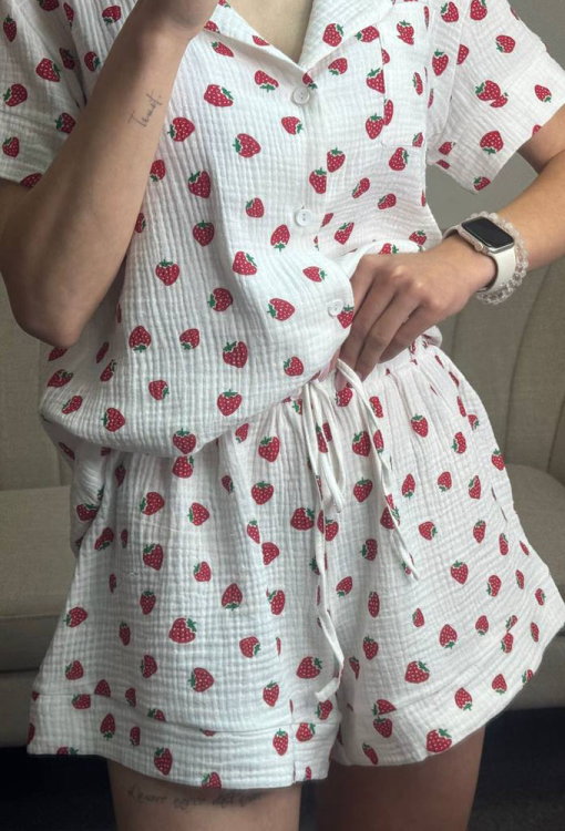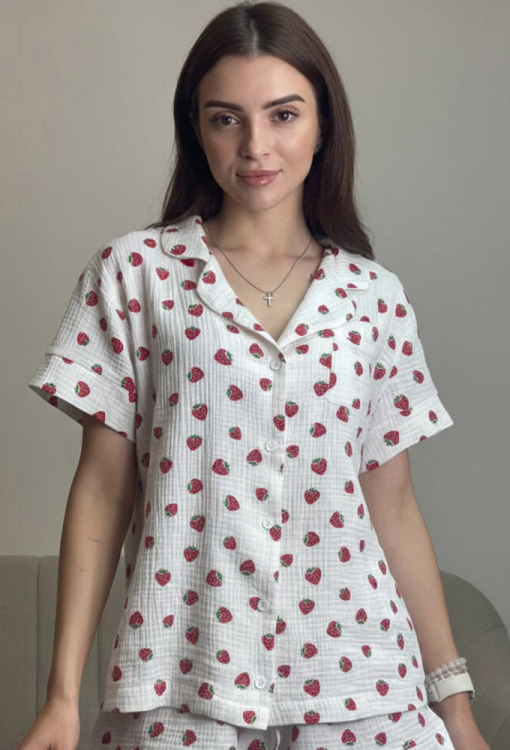 Чарівна жіноча піжама від українського бренду V.Velika. Піжама виконана з м'якого та якісного мусліну, білого кольору з принтом у вигляді червоних полуничок, складається з сорочки та шорт вільного силуету. Сорочка з короткими рукавами та відкладним коміром, застібається на ґудзики, на грудях зліва прикрашена маленькою накладною кишенькою, рукави оброблені вільними манжетами. Шорти з м'якою гумкою в поясі та широкими манжетами, регулюються по ширині за допомогою внутрішнього шнурка. Піжама дуже красива і комфортна, підійде як домашній одяг, а також може бути відмінним подарунком коханій або близькій людині.