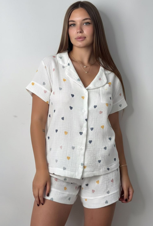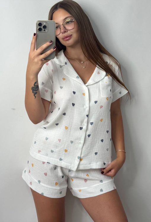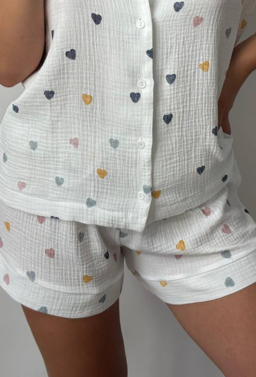 Легка жіноча піжама від українського бренду V.Velika. Піжама виконана з м'якого та якісного мусліну, білого кольору з принтом у вигляді різнокольорових сердечок, складається з сорочки та шорт вільного силуету. Сорочка з короткими рукавами та відкладним коміром, застібається на ґудзики, на грудях зліва прикрашена маленькою накладною кишенькою, рукави оброблені вільними манжетами. Шорти з м'якою гумкою в поясі та широкими манжетами, регулюються по ширині за допомогою внутрішнього шнурка. Піжама дуже красива і комфортна, підійде як домашній одяг, а також може бути відмінним подарунком коханій або близькій людині.