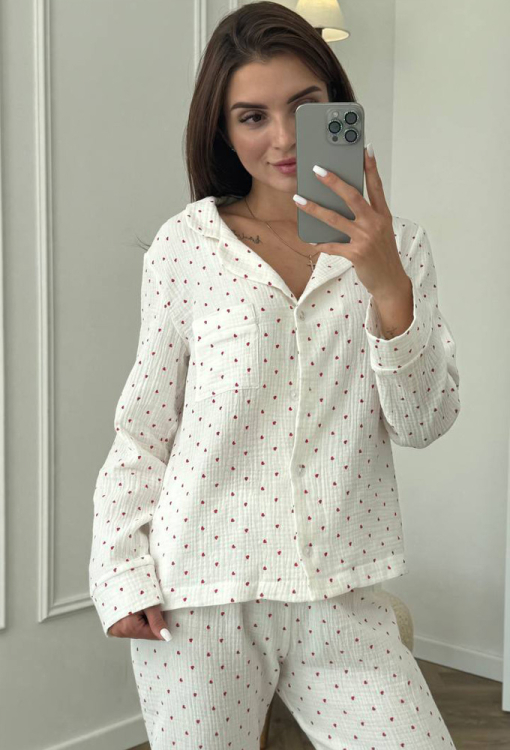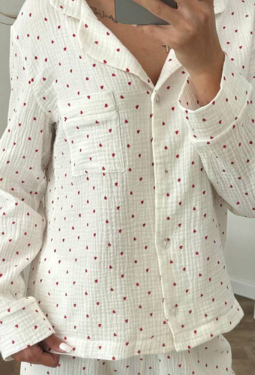 Романтична жіноча піжама від українського бренду V.Velika. Піжама виконана з м'якого та якісного мусліну, білого кольору з принтом у вигляді дрібних сердець червоного кольору, складається з сорочки та штанів прямого силуету. Сорочка з довгими рукавами та відкладним коміром, застібається на ґудзики, на грудях зліва прикрашена маленькою накладною кишенькою, рукави оброблені вільними манжетами. Штани з м'якою гумкою в поясі та широкими манжетами створюють зручну посадку, не обмежують рухів. Піжама дуже красива і комфортна, підійде як домашній одяг, а також може бути відмінним подарунком коханій або близькій людині.
