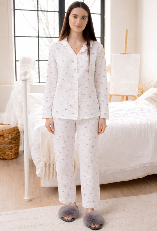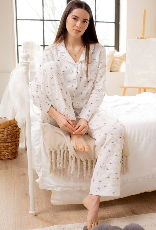 Комфортна жіноча піжама від українського бренду V.Velika. Піжама виконана з м'якого та якісного мусліну, білого кольору з принтом у вигляді кульбаб, складається з сорочки та штанів прямого силуету. Сорочка з довгими рукавами та відкладним коміром, застібається на ґудзики, на грудях зліва прикрашена маленькою накладною кишенькою. Штани з м'якою гумкою в поясі створюють зручну посадку, не обмежують рухів. Піжама дуже красива і стильна, підійде як домашній одяг, а також може бути відмінним подарунком коханій або близькій людині.