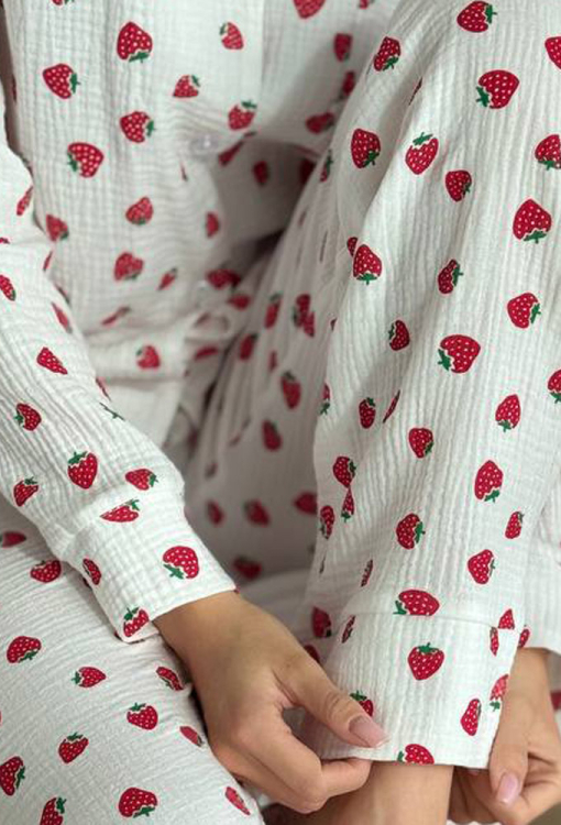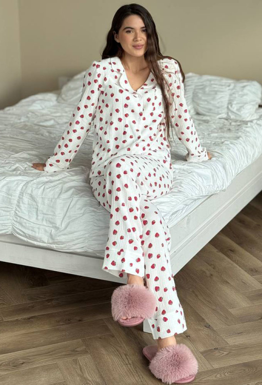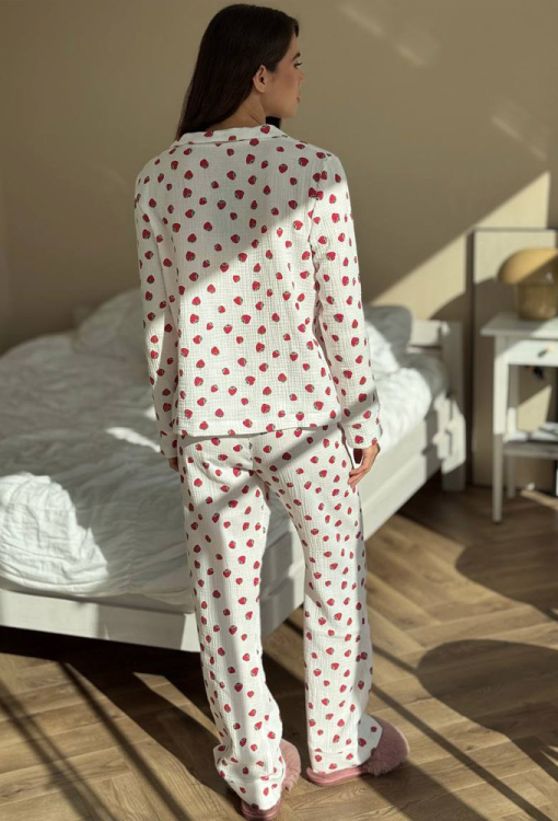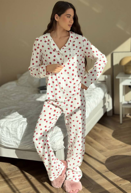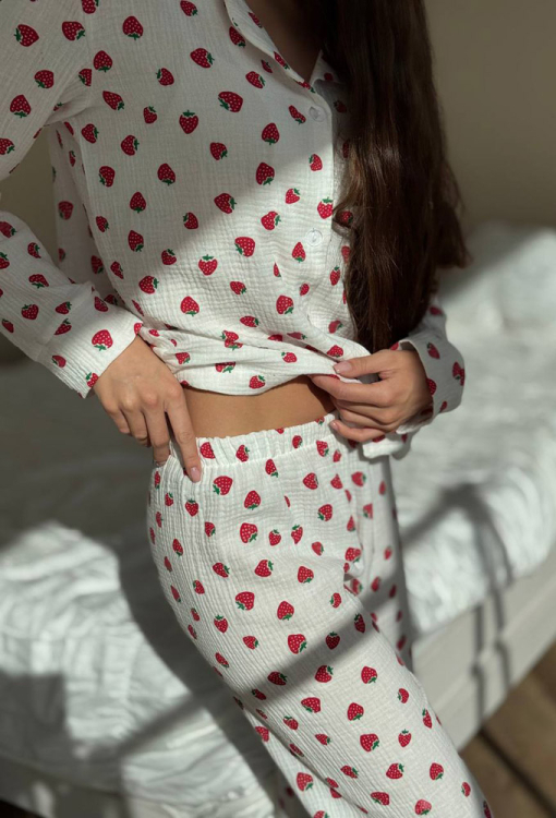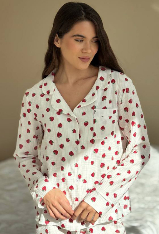 Зручна жіноча піжама від українського бренду V.Velika. Піжама виконана з м'якого та якісного мусліну, білого кольору з принтом у вигляді полуниці червоного кольору, складається з сорочки та штанів прямого силуету. Сорочка з довгими рукавами та відкладним коміром, застібається на ґудзики, на грудях зліва прикрашена маленькою накладною кишенькою, рукави оброблені вільними манжетами. Штани з м'якою гумкою в поясі та широкими манжетами створюють зручну посадку, не обмежують рухів. Піжама дуже красива і комфортна, підійде як домашній одяг, а також може бути відмінним подарунком коханій або близькій людині.