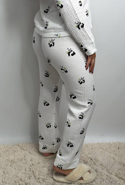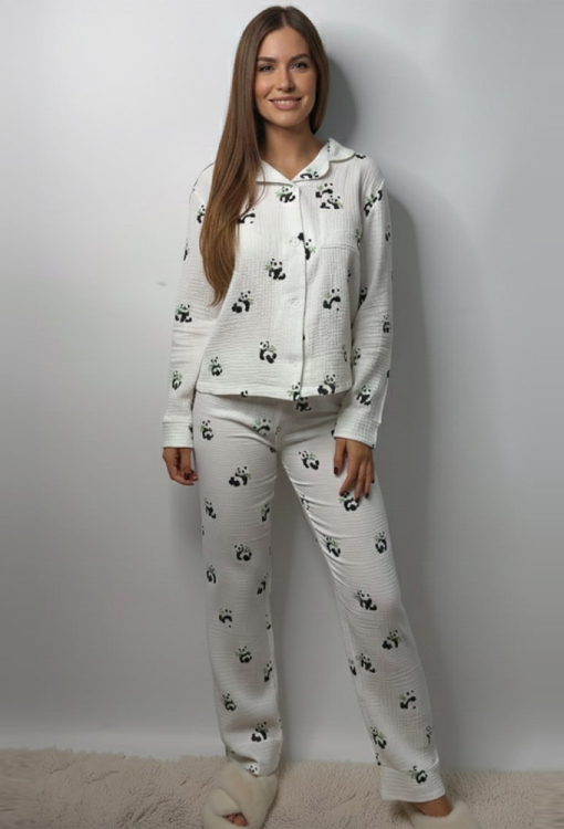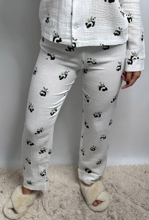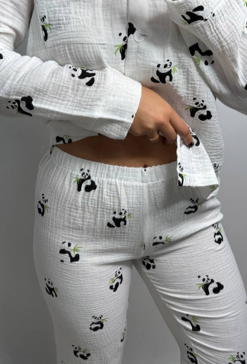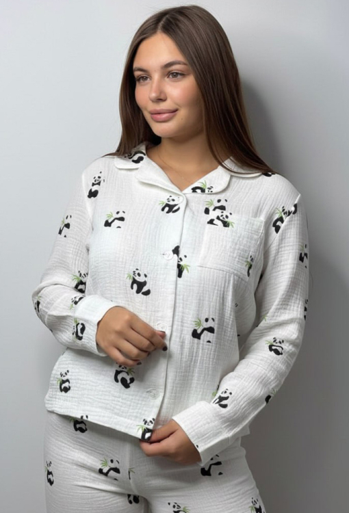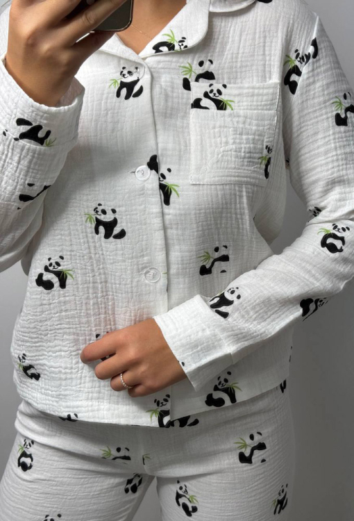 Стильна жіноча піжама від українського бренду V.Velika. Піжама виконана з м'якого та якісного мусліну, білого кольору з принтом у вигляді кумедних панд, складається з сорочки та штанів прямого силуету. Сорочка з довгими рукавами та відкладним коміром, застібається на ґудзики, на грудях зліва прикрашена маленькою накладною кишенькою, рукави оброблені вільними манжетами. Штани з м'якою гумкою в поясі та широкими манжетами створюють зручну посадку, не обмежують рухів. Піжама дуже красива і комфортна, підійде як домашній одяг, а також може бути відмінним подарунком коханій або близькій людині.