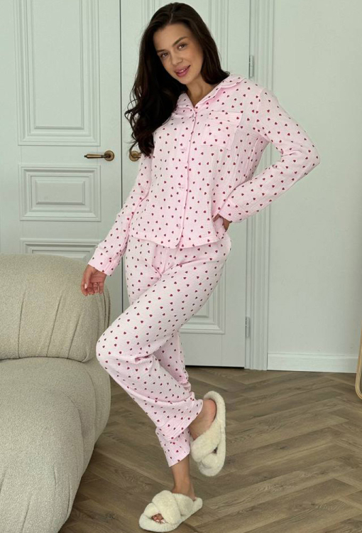 Романтична жіноча піжама від українського бренду V.Velika. Піжама виконана з м'якого та якісного мусліну, рожевого кольору в червоні серця, складається з сорочки та штанів прямого силуету. Сорочка з довгими рукавами на вільних манжетах та відкладним коміром, застібається на ґудзики, на грудях зліва прикрашена маленькою накладною кишенькою. Штани зі зручною посадкою та м'якою гумкою в поясі, внизу оброблені вільними манжетами. Піжама дуже красива і комфортна, підійде як домашній одяг, а також може бути відмінним подарунком коханій або близькій людині.