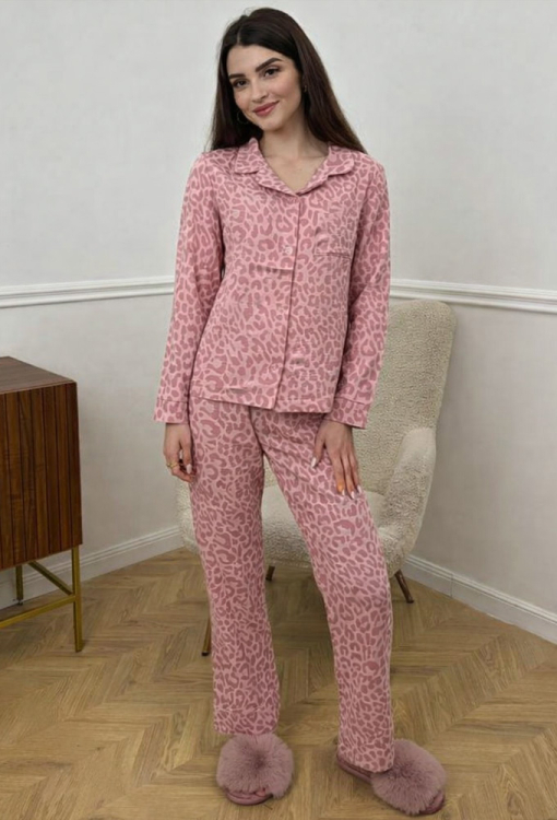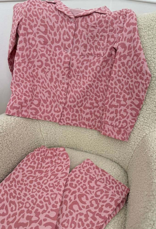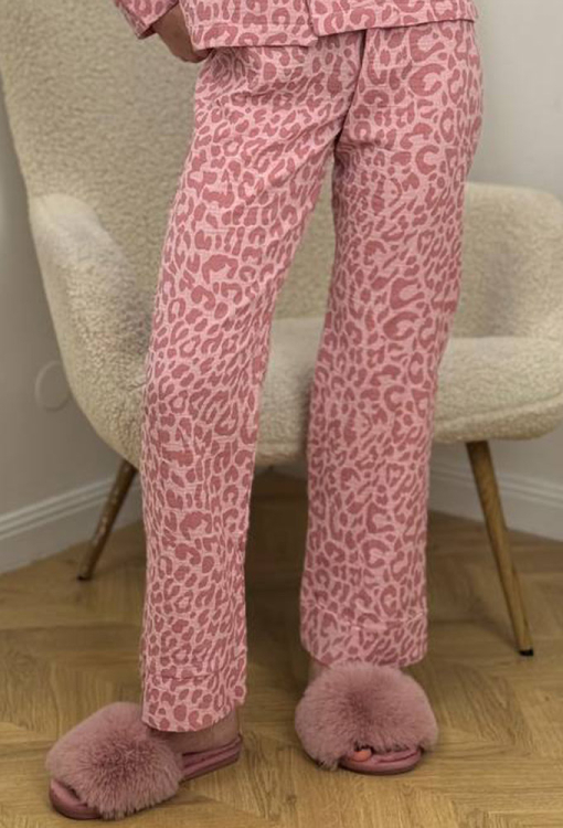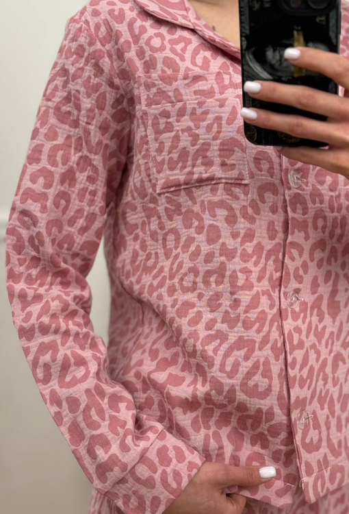 Приваблива жіноча піжама від українського бренду V.Velika. Піжама виконана з м'якого та якісного мусліну, рожевого кольору з темно-рожевим леопардовим принтом, складається з сорочки та штанів прямого силуету. Сорочка з довгими рукавами на вільних манжетах та відкладним коміром, застібається на ґудзики, на грудях зліва прикрашена маленькою накладною кишенькою. Штани зі зручною посадкою та м'якою гумкою в поясі, внизу оброблені вільними манжетами. Піжама дуже красива і комфортна, підійде як домашній одяг, а також може бути відмінним подарунком коханій або близькій людині.