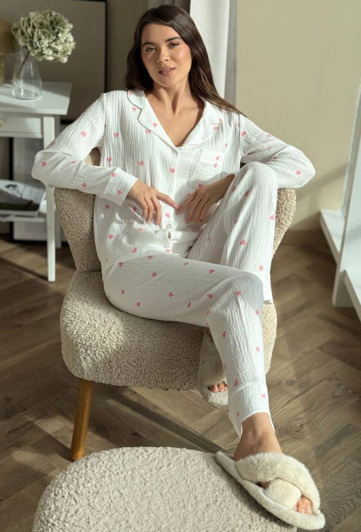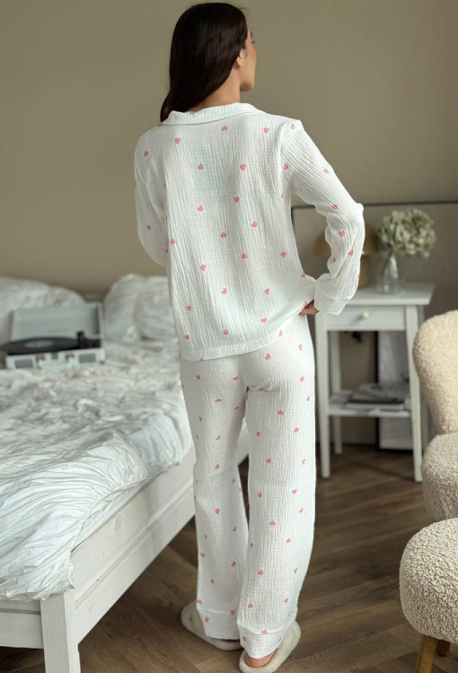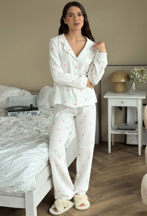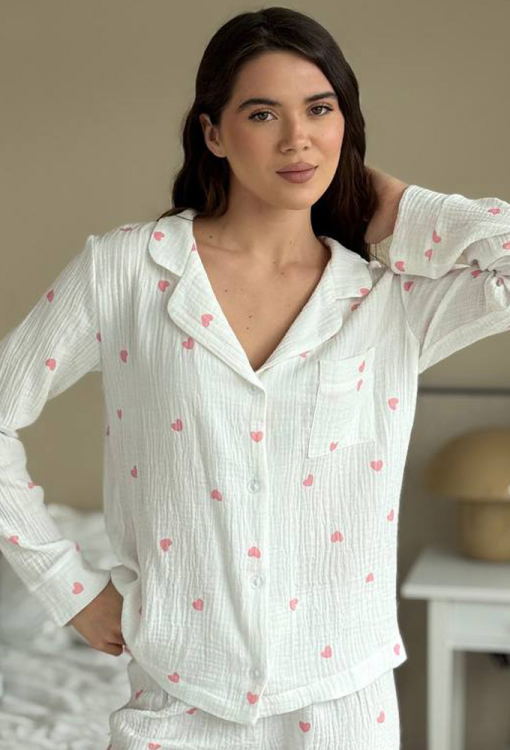 Ніжна жіноча піжама від українського бренду V.Velika. Піжама виконана з м'якого та якісного мусліну, білого кольору в принт із рожевих сердечок, складається з сорочки та штанів прямого силуету. Сорочка з довгими рукавами на вільних манжетах та відкладним коміром, застібається на ґудзики, на грудях зліва прикрашена маленькою накладною кишенькою. Штани зі зручною посадкою та м'якою гумкою в поясі, внизу оброблені вільними манжетами. Піжама дуже красива і комфортна, підійде як домашній одяг, а також може бути відмінним подарунком коханій або близькій людині.