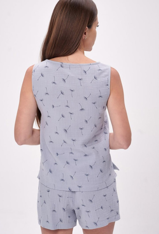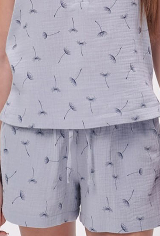 Літня жіноча піжама від українського бренду Wiktoria. Піжама виконана з якісного та м'якого мусліну, джинсового кольору з ніжним принтом у вигляді кульбаб, складається з майки та шортів. Майка прямого силуету, з широкими бретелями, круглим вирізом горла та невеликими розрізами з боків, на грудях оброблена планкою з ґудзиками. Шорти також вільного крою, з м'якою гумкою в поясі та зручними бічними кишенями, регулюються по ширині за допомогою внутрішнього шнурка. Піжама дуже красива і комфортна, може бути використана як домашній одяг або подарунок коханій та близькій людині.