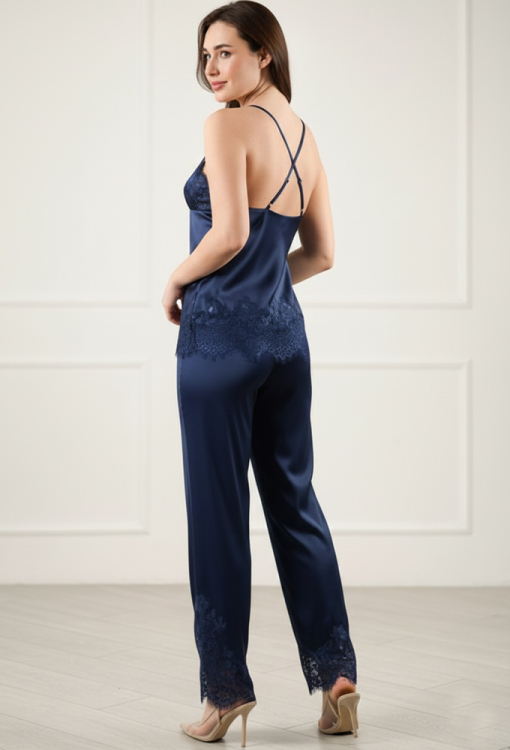 Ефектна жіноча піжама із колекції Tourmaline від українського бренду Komilfo. Піжама виконана з м'якого та якісного шовк-сатину темно-синього кольору, складається з майки та штанів. Майка напівприлеглого силуету, з тонкими регульованими бретелями схрещеними на спині, підрізом під грудьми та V-подібним декольте. Виріз виробу, полиця вздовж та низ прикрашені вставками у поєднанні з аплікаціями з ажурного мережива. Штани прямого крою зі зручною посадкою та м'якою гумкою в поясі, внизу прикрашені широкими мереживними вставками. Піжама дуже красива та комфортна, також може бути чудовим варіантом подарунка близьким людям!