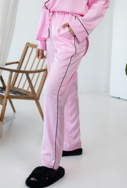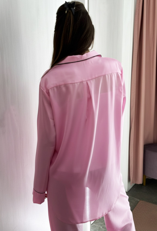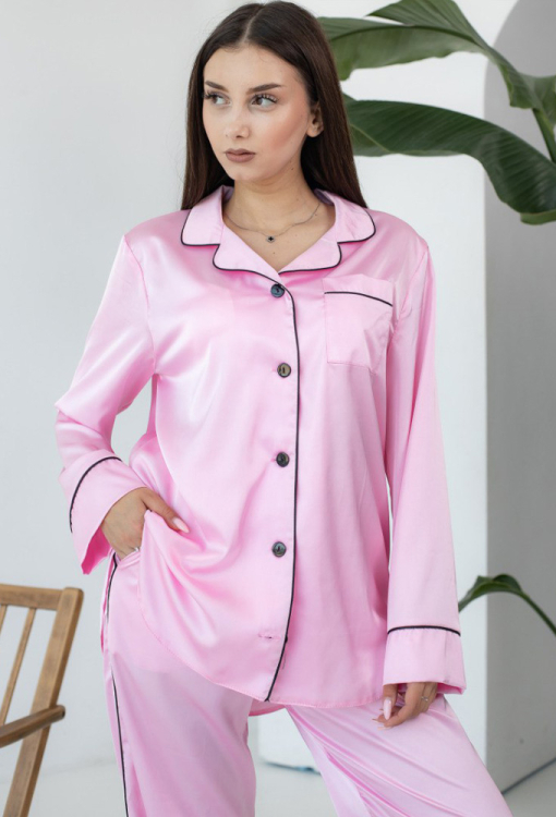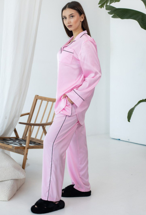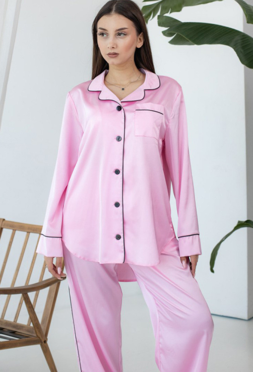 Стильна жіноча піжама від українського бренду BO.Brand створена для комфорту та елегантного домашнього образу. Піжама виконана з якісного та м'якого шовку Армані рожевого кольору, складається з сорочки вільного силуету та широких штанів. Сорочка з довгими рукавами на вільних манжетах, відкладним коміром і застібкою на ґудзики доповнена невеликою кишенею на грудях зліва. Злегка подовжена спинка, поздовжня складка та закруглені полиці створюють легкий та невимушений силует, комір, полиці, рукави та кишеню оброблено тонким кантом чорного кольору. Штани з м'якою гумкою в поясі, зручними бічними кишенями та внутрішнім шнурком для регулювання посадки, з боків прикрашені контрастним кантом. Піжама елегантна та комфортна на кожен день, ідеально підходить для сну та домашнього відпочинку, а також стане чудовим подарунком для близької людини.
