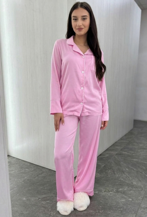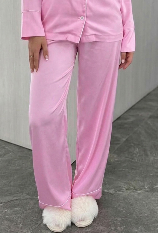 Класична жіноча піжама від українського бренду BO.Brand. Піжама виконана з якісного та м'якого шовку Армані рожевого кольору, складається з сорочки прямого силуету та широких штанів. Сорочка з довгими рукавами на вільних манжетах та відкладним коміром, застібається на ґудзики, на грудях зліва прикрашена маленькою кишенькою. Комір, полиці, рукави та кишеня моделі оброблені тонким кантом білого кольору. Штани зі зручною посадкою та м'якою гумкою в поясі, внизу оброблені вільними манжетами та прикрашені білим кантом. Піжама дуже красива, легка та комфортна, ідеальна для сну та домашнього відпочинку, а також може бути чудовим подарунком коханій та близькій людині.